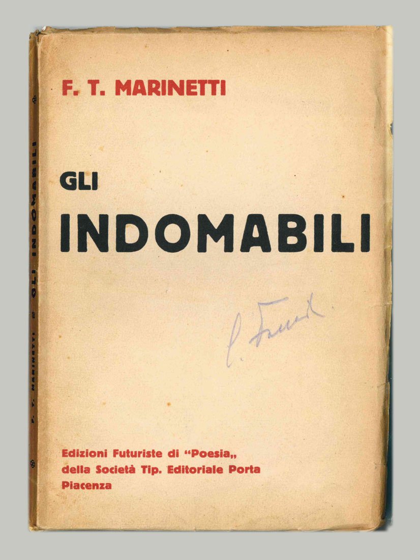 LIBROEdizione originale.Più che buon esemplare, quasi ottimo (normale brunitura perimetrale e sul dorso lievemente inclinato; firma d’appartenenza d’epoca sulla copertina; minime sfrangiature ai bordi dell’unghiatura).Rara “princeps” di questo particolarissimo «pseudo-romanzo» marinettiano, vergato in stile insistentemente allegorico su suggestioni fantascientifiche — fu Silvio Benco nella sua recensione d’epoca a fare per primo il nome di H.G. Wells, a diverse opere del quale viene naturale riferire più di un elemento dell’intreccio (anche se Marinetti protestò vivacemente) — con innesti paroliberi. -- Secondo e ultimo titolo a uscire per le «Edizioni futuriste» Porta di Piacenza, dirette da Marinetti e Carli con un interessante programma editoriale quasi del tutto irrealizzato: esordirono con «Trillirì» di Carli nello stesso 1922, poi questo titolo di Marinetti e più nulla; dei previsti quattro titolo elencati qui in quarta di copertina, due passarono all’editore Campitelli di Foligno («Architettura futurista» di Marchi e l’«Opera completa» di Boccioni), uno fu rimesso nelle mani dell’autore, che lo fece pubblicare altrimenti («Ninì Champagne» di Cangiullo), il terzo sembrerebbe mai pubblicato («L’eleganza» di Remo Chiti).Bibl. Cammarota, Marinetti, n. 95