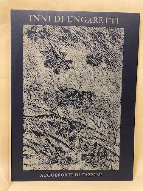 Brossura editoriale blu illustrata da Fazzini con risvolti, acetato di protezione, entro camicia e cofanetto, esemplare perfetto. Gli inni di Ungaretti adorni da tre acqueforti di Pericle Fazzini (più la copertina), IX.volume dei poeti illustrati nella nuova serie. Composto a mano da Franco Riva con carattere Janson sul suo torchio privato in carta a tino di Pescia, tiratura 150 esemplari numerati (ns. 32) e firmati a matita dall'artista.