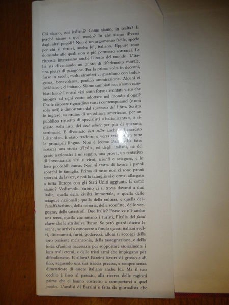 DESCRIZIONE: Mondadori Editore Milano 1966 VI Ed., br. ed. con sovracc. ill. col. con astuccio pp. 435 in 8° con fascetta editoriale. Nel 1964 Luigi Barzini, su commissione di un editore americano, tentò di intercettare la nostra identità in un saggio, Gli italiani, descrivendo l'Italia della civiltà immortale e quella delle sciagure nazionali, senza dimenticare l'Italia piena di fascino amata dai turisti. Erano gli anni del boom, la nostra democrazia si andava consolidando, il nostro design dettava legge, così come la nostra cinematografia, la letteratura, il teatro e persino le automobili. Capire chi eravamo diventava quindi un'esigenza diffusa. Oggi, a oltre quarant'anni dalla sua pubblicazione, il saggio di Barzini rivela ancora una forza dirompente. Perché nel leggere questa avvincente riflessione sulla nostra storia e sul nostro costume la domanda che ci si pone è insieme semplice e complessa: che libro avrebbe scritto Barzini se avesse dovuto scriverlo oggi? In che cosa ci siamo evoluti e che cosa, invece, è rimasto immobile e mineralizzato? Indice completo in foto. CONDIZIONI: Ottime/Perfette. PESO / WEIGHT: 715 gr. without package