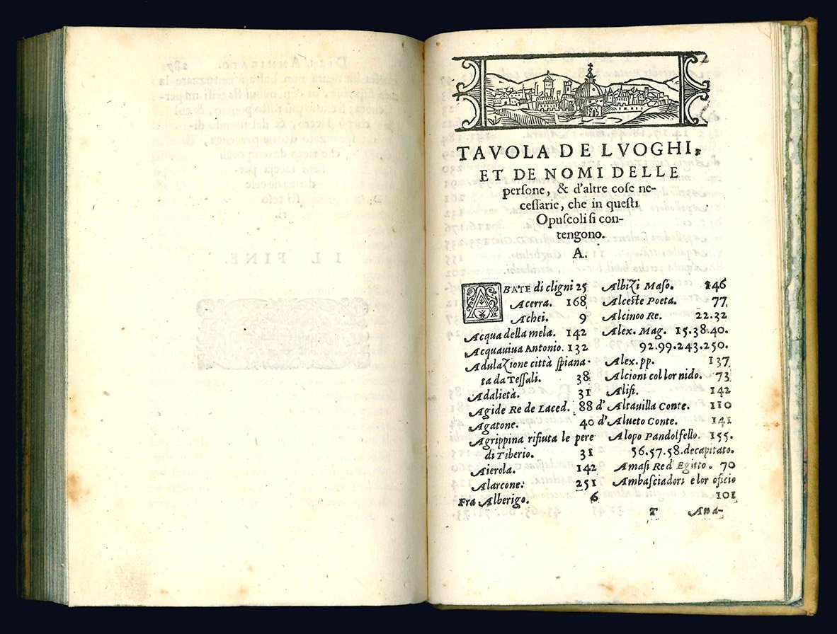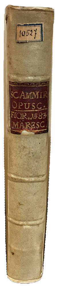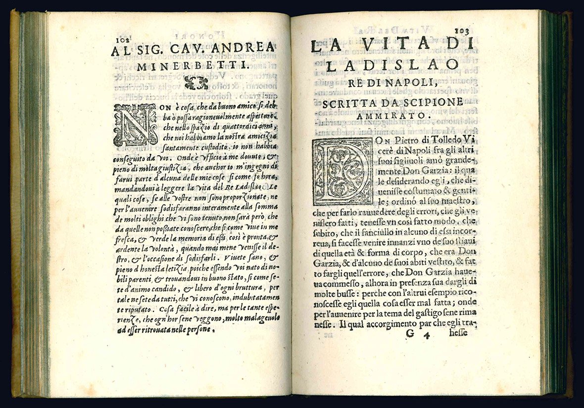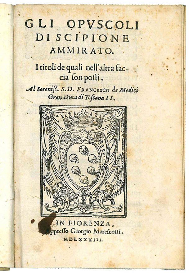 RARA PRIMA EDIZIONE. Il volume contiene otto opere, i cui titoli sono elencati al verso del frontespizio: Della Hospitalità, Della Diligenza, Se gli honori si debbono proccurare, La Vita del Re Ladislao, La Vita della Reina Giovanna, Orazione in morte del Gran Duca Cosimo, Lettera alla Signora Donna Leonora di Toledo in materia d'una impresa, I Paralleli. Si tratta di scritti di carattere occasionale che furono poi inclusi nella raccolta postuma in tre volumi edita dal segretario dell'Ammirato, Cristoforo dal Bianco, fra il 1637 e il 1642.