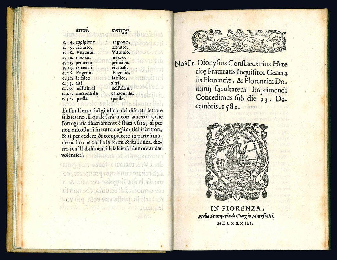 In-8vo (mm. 161x105). Pp. [16], 287, [13]. Segnatura: π8 A-S8 T6. Stemma xilografico del dedicatario, Francesco de' Medici, al frontespizio. Marca tipografica e colophon a c. π8r. Frontalini, capilettera e fregi xilografici. Bella legatura settecentesca in piena pergamena rigida, dorso a quattro nervetti con titolo in oro su tassello in marocchino rosso e piccola etichetta con segnatura manoscritta, tagli azzurri, risguardi marmorizzati. Al contropiatto anteriore etichetta con segnatura manoscritta (la stessa del dorso) e bel ex-libris nobiliare inciso “Ex libris Nob. V. Aloysii Cibrarii”. Luigi Cibrario(Torino, 1802-Trebiolo, 1870), insigne storiografo sabaudo, fu funzionario nel ministero degli Interni del Regno di Sardegna e nel 1827 pubblicò la sua prima opera storica (Delle storie di Chieri). Dal 1830 fu membro dell'Accademia delle scienze. La sua fama è legata all'opera Della economia politica del Medioevo. Uomo di fiducia di Carlo Alberto durante il periodo delle riforme e senatore dal 21 ottobre del 1848, fu poi nominato ministro delle Finanze e successivamente dell'Istruzione pubblica e degli Esteri durante il governo di Cavour. Diminuito l'impegno politico, tornò a dedicarsi agli studi storici. Macchia d'inchiostro al frontespizio, fioriture marginali su alcune carte, piccolo forellino a c. G8 che comporta la perdita di alcune lettere. Ottima copia fresca e marginosa.