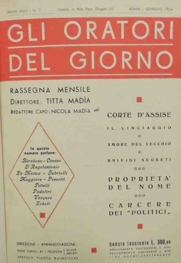 Gli oratori del giorno. Rassegna mensile (direttore: Titta Madia), Roma, anno XXIII, nn. 1-12, gennaio-dicembre 1954, annata completa di 12 numeri (di cui due doppi: maggio-giugno e settembre-ottobre), pp. 60 circa per numero (pp. 72 cad. per i numeri doppi), per un totale di pp. 616, ill. b.n., cm 24, legatura in tutta tela con titoli in oro al dorso. Minime fioriture, lieve brunitura della carta, qualche sgualcitura e traccia di piegatura, per il resto volume in perfetto stato di conservazione e con legatura solida.