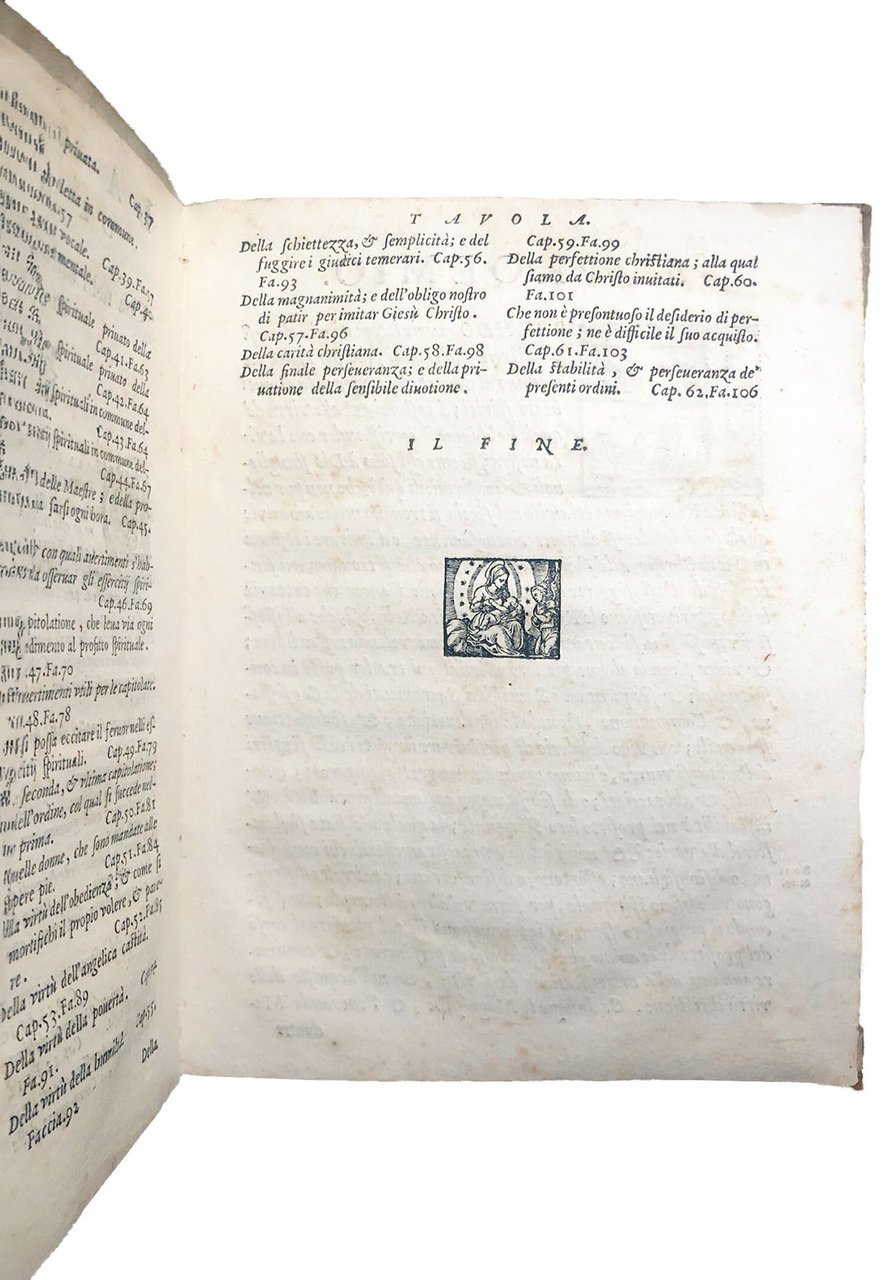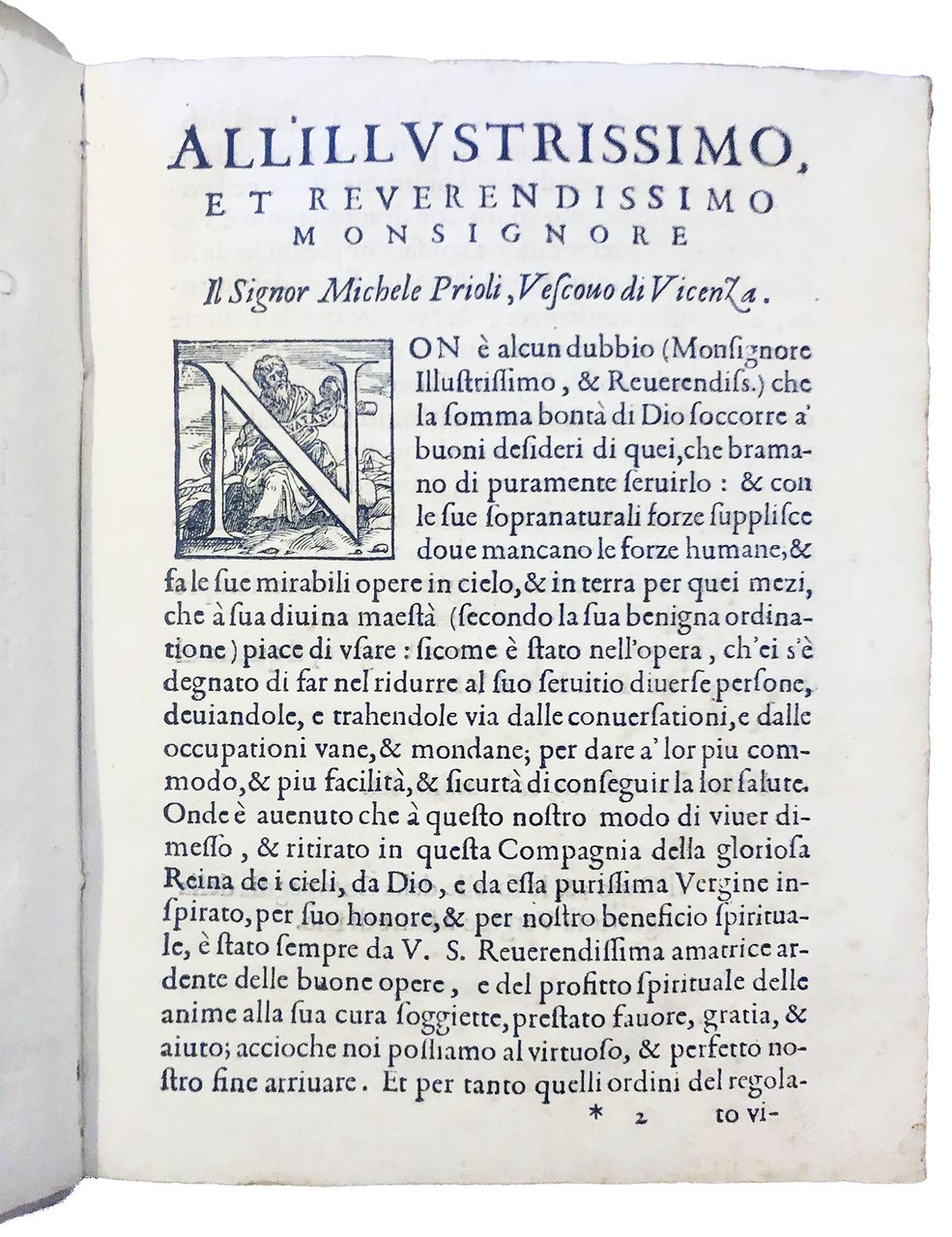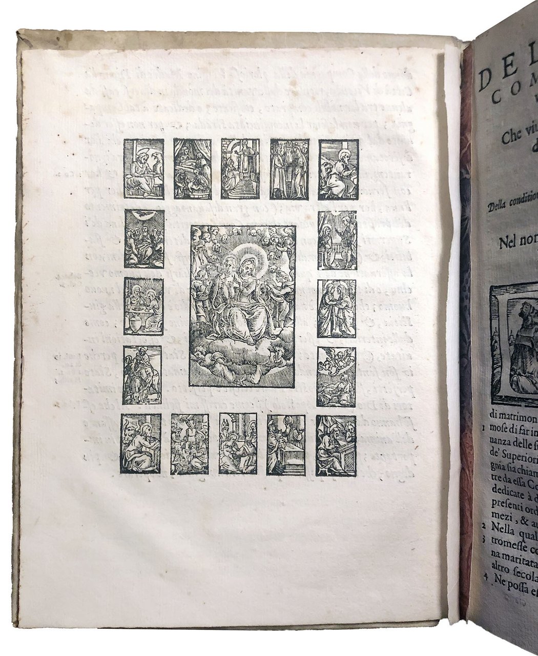 4to (196x150). [12], 109, [3] pp. Collation: *6 A-O4. Woodcut device with St. Catherine of Alexandria kneeling before the Virgin Mary and Child on the title page, woodcut vignette of the Virgin Mary and Child in heaven surrounded by 16 smaller vignettes of the four Evangelists and 12 events from the life of the Virgin on l. *6v, woodcut vignette of the Virgin Mary and Child in heaven with angels within a typographic frame on l. O3r, woodcut coats-of-arms of the Cardinals Michele Priuli and Agostino Valier facing each other at the bottom of their respective letters of approval of the Ordini on ll. O3v-4r, colophon on l. O4v. With a dedication by the master and sisters of the Congregation to the Bishop of Vicenza Michele Priuli (1547-1603) dated 4 April 1587, followed by another dedication addressed by Antonio Pagani (from Monte San Felice, 1 September 1584) to the sisters of the Congregation and in particular to patronesses Deianira and Angela Valmarana, and Isabetta Franceschini who helped him to found the Order. With several historiated and decorative woodcut initials. Roman and italic types. 18th-century vellum, pastedowns covered with colored floral paper. A clean, well-preserved copy.
