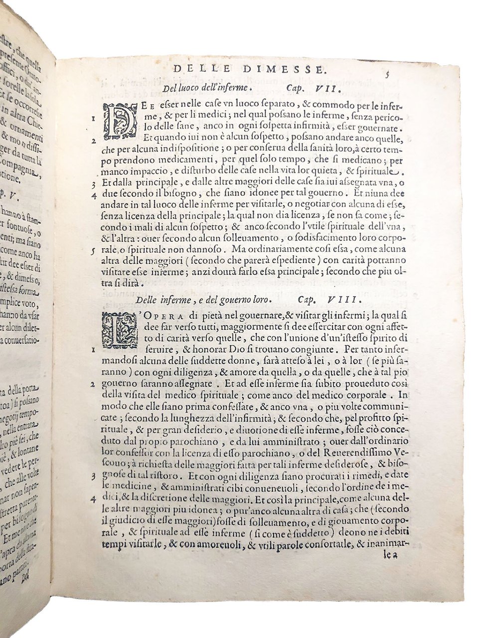First edition (reprinted in 1617, 1672, and 1889) of the statutes of the Congregation of the “Suore dimesse figlie di Maria Immacolata”, a female religious institution founded in Vicenza in 1579 by Antonio Pagani, a friar of the local convent of the Minor Observants of San Biagio. In 1584 the Bishop of Vicenza, Michele Priuli (1547-1603) and the Apostolic Visitor in Vicenza, Agostino Valier (1531-1606) approved the congregation and its statutes (their letters of approval dated 1584 are printed at the end of the edition together with their coats-of-arms, ll. O3v-4r). The new order quickly spread to other towns of the Republic of Venice: in 1595 a new institute was founded in Murano, followed by others in Thiene, Schio, Feltre, Verona, Bergamo, Verona, Padua (1615), and Udine (1656). In 1810, only the houses of Udine and Padua survived the Napoleonic suppression of the religious orders. The Dimesse still exist today and, since 1842, have devoted themselves mainly to the education of girls (dimesse.it/about-us/).