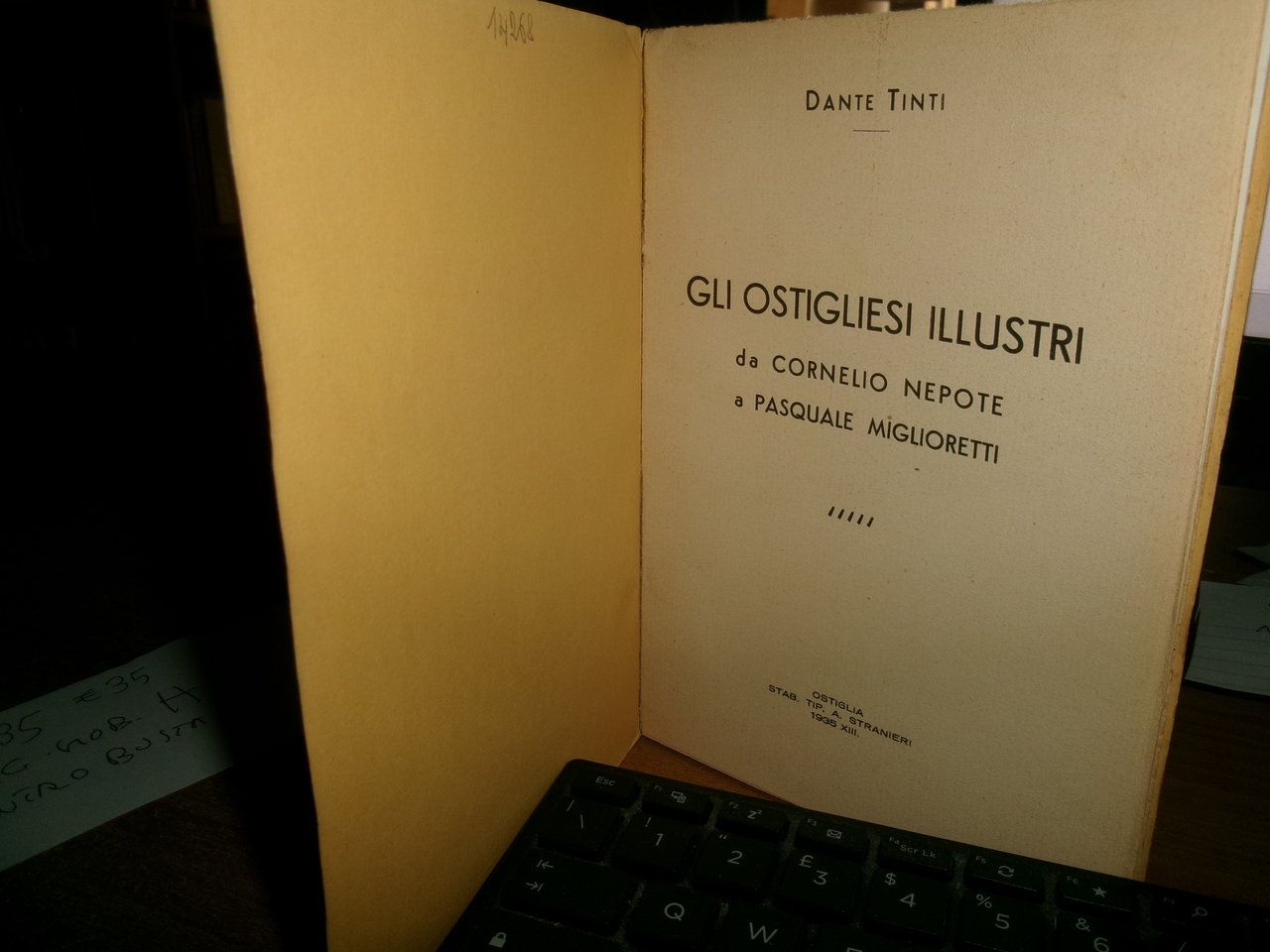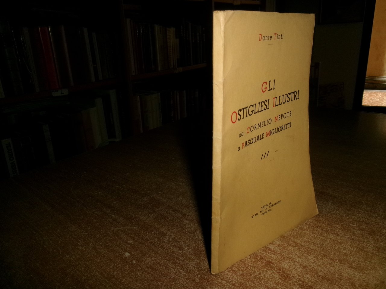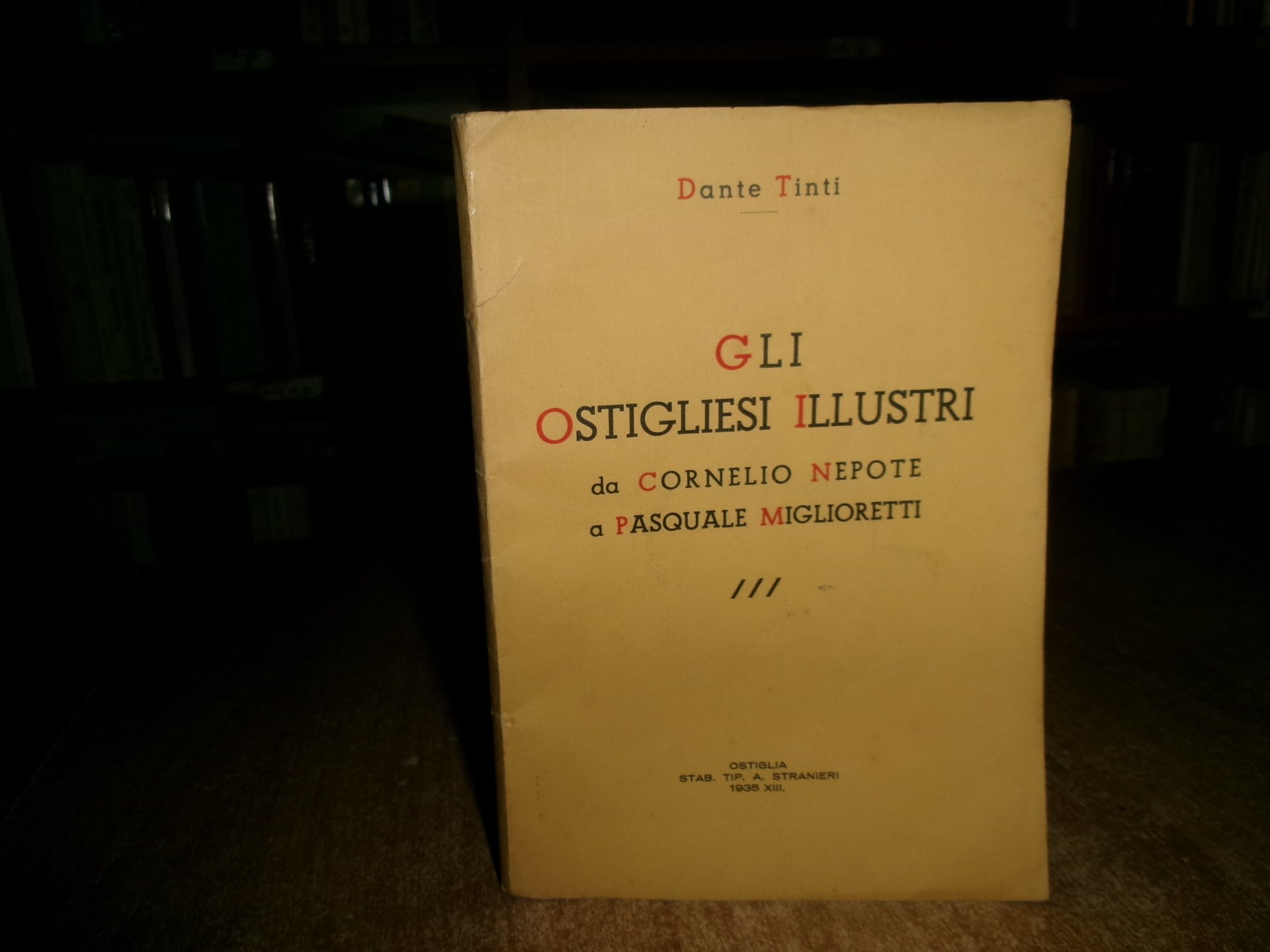 TINTI Dante. Ostiglia, Stab. Tip. A. Stranieri, 1935. Gli OSTIGLIESI ILLUSTRI da Cornelio Nepote a Pasquale Miglioretti. In-8° piccolo, br. orig. 82, (2) pp. Ottimo stato. Neg. mob. H entro busta trasp.