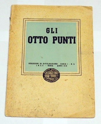Gli otto punti, Istituto Nazionale di Cultura Fascista, Roma 1942, pp. 31, cm 23, br. ed. Collana Quaderni di Divulgazione, serie II, n. 2. Supplemento a Civiltà fascista, n. 10, ottobre 1941.  Fioriture alla brossura, ma per il resto buon esemplare, intonso.