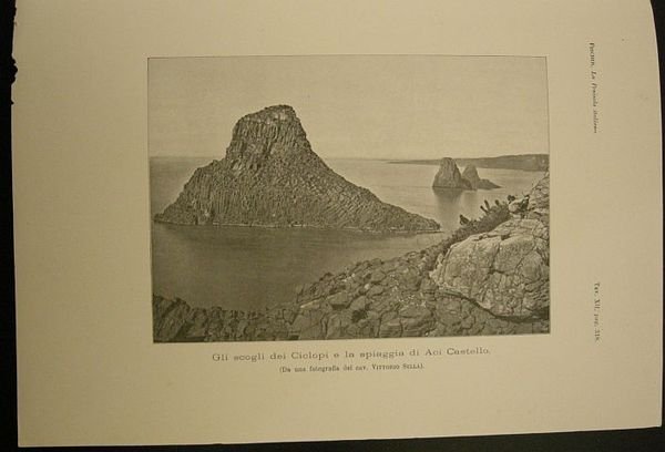 Gli scogli dei Ciclopi e la spiaggia di Aci Castello (da una fotografia del cav. Vittorio Sella). Tratto da " La penisola italiana : saggio di corografia scientifica" di Teobaldo Fischer.
