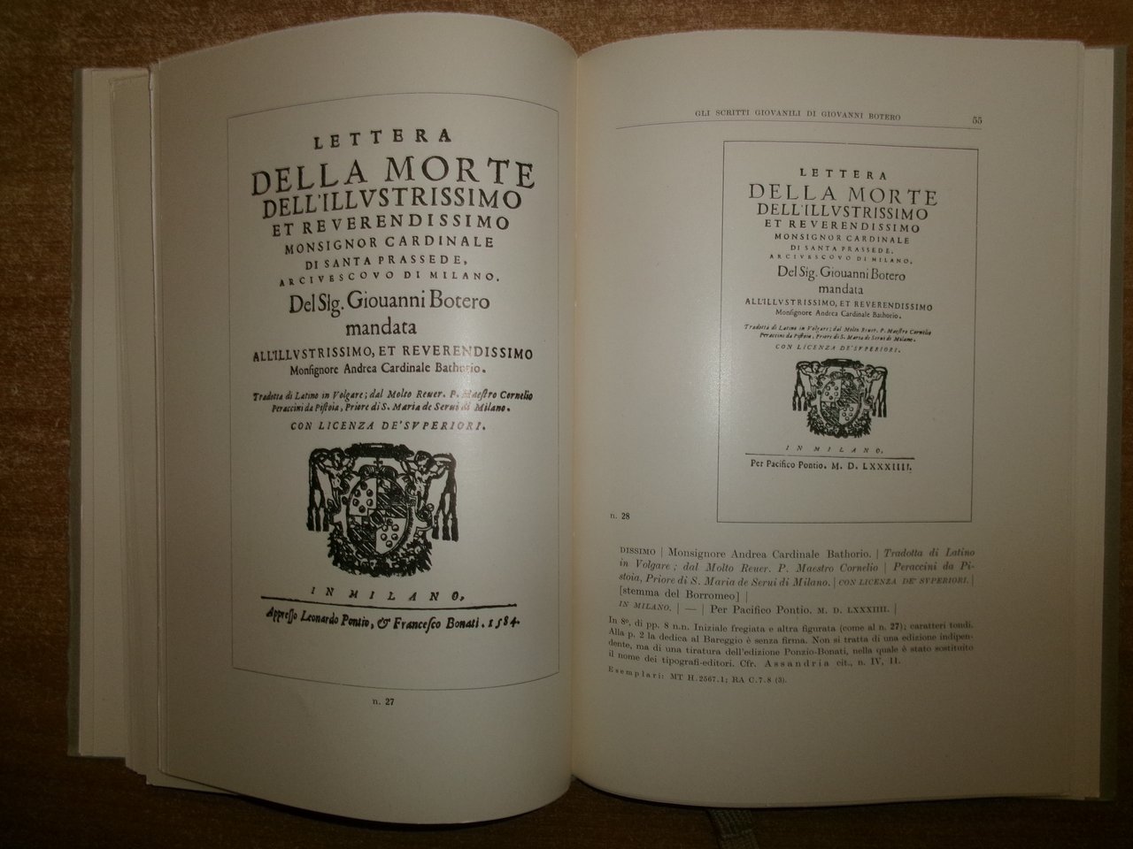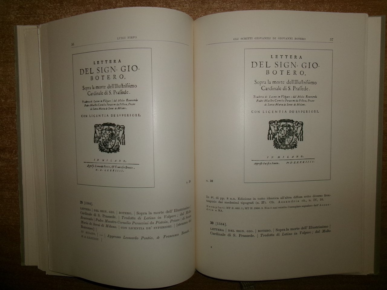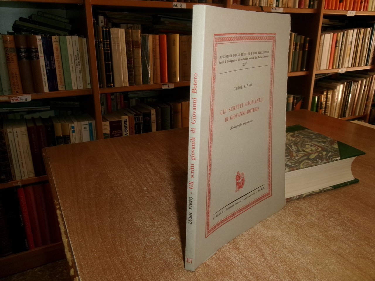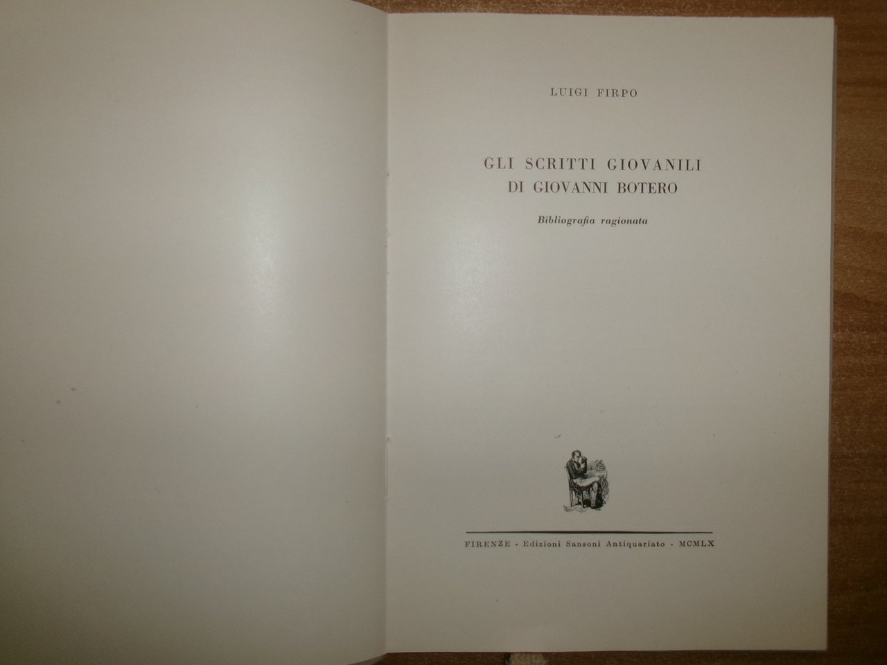LUIGI FIRPO. Firenze, Sansoni Antiquariato, 1960. Gli Scritti Giovanili di GIOVANNI BOTERO. Bibliografia ragionata. In-8°, br. 88 pp. con numerosi fac-simili n.t. Come nuovo. Neg. mob. nero 9 entro busta trasp.