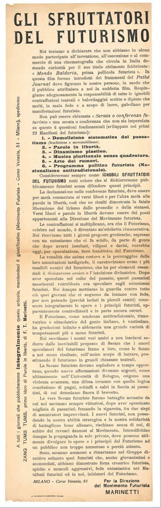 MANIFESTOEdizione originale. Ottimo esemplare.Raro comunicato stampa originale, prende spunto dal film pseudofuturista «Mondo Baldoria. Prima pellicola futurista» (Aldo Molinari, feb. 1914) per screditare tutti coloro che si dichiarano futuristi senza esserlo, e per riaffermare i canoni del movimento. «Il volantino viene pubblicato su Lacerba Anno I n. 7, 1 aprile 1914» (Tonini).Tonini, I manifesti, 79.1