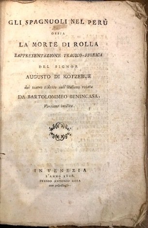 Gli Spagnuoli nel Perù ossia la morte di Rolla. Rappresentazione tragico-storica del signor Augusto di Kotzebue. Dal teatro tedesco sull’italiano recata da Bartolommeo Benincasa. Versione inedita