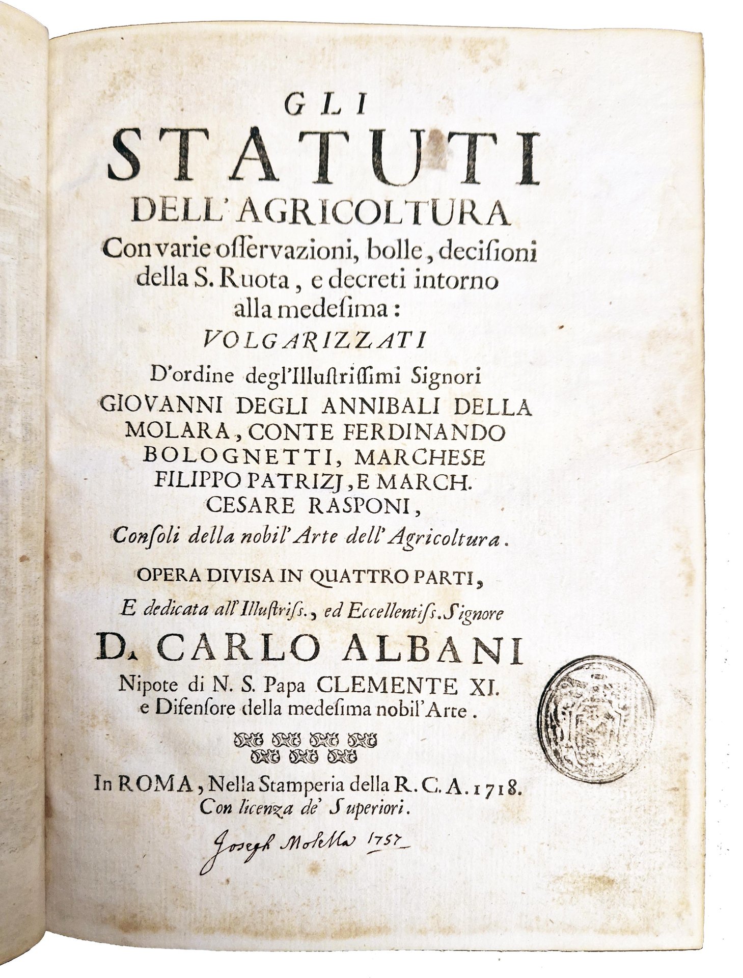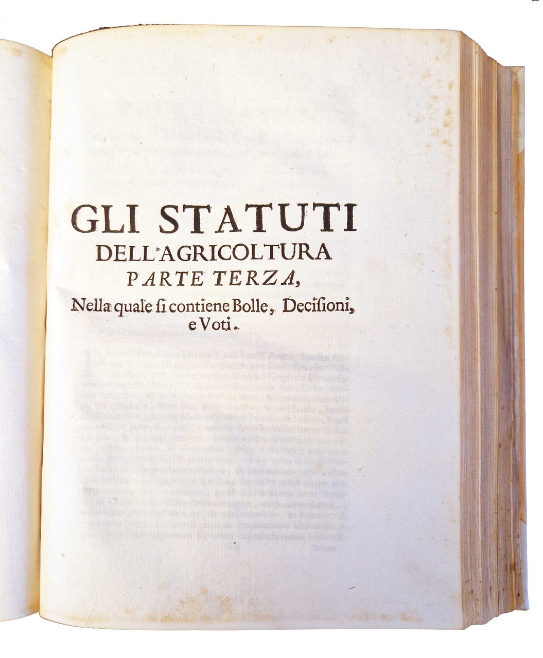 Gli statuti dell’agricoltura, con varie osservazioni, bolle, decisioni della S. Ruota, e decreti intorno alla medesima: volgarizzati d'ordine degl'illustrissimi signori Giovanni Degli Annibali Della Molara, conte Ferdinando Bolognetti, marchese Filippo Patrizj, e march. Cesare Rasponi, […] opera divisa in quattro parti, […].
