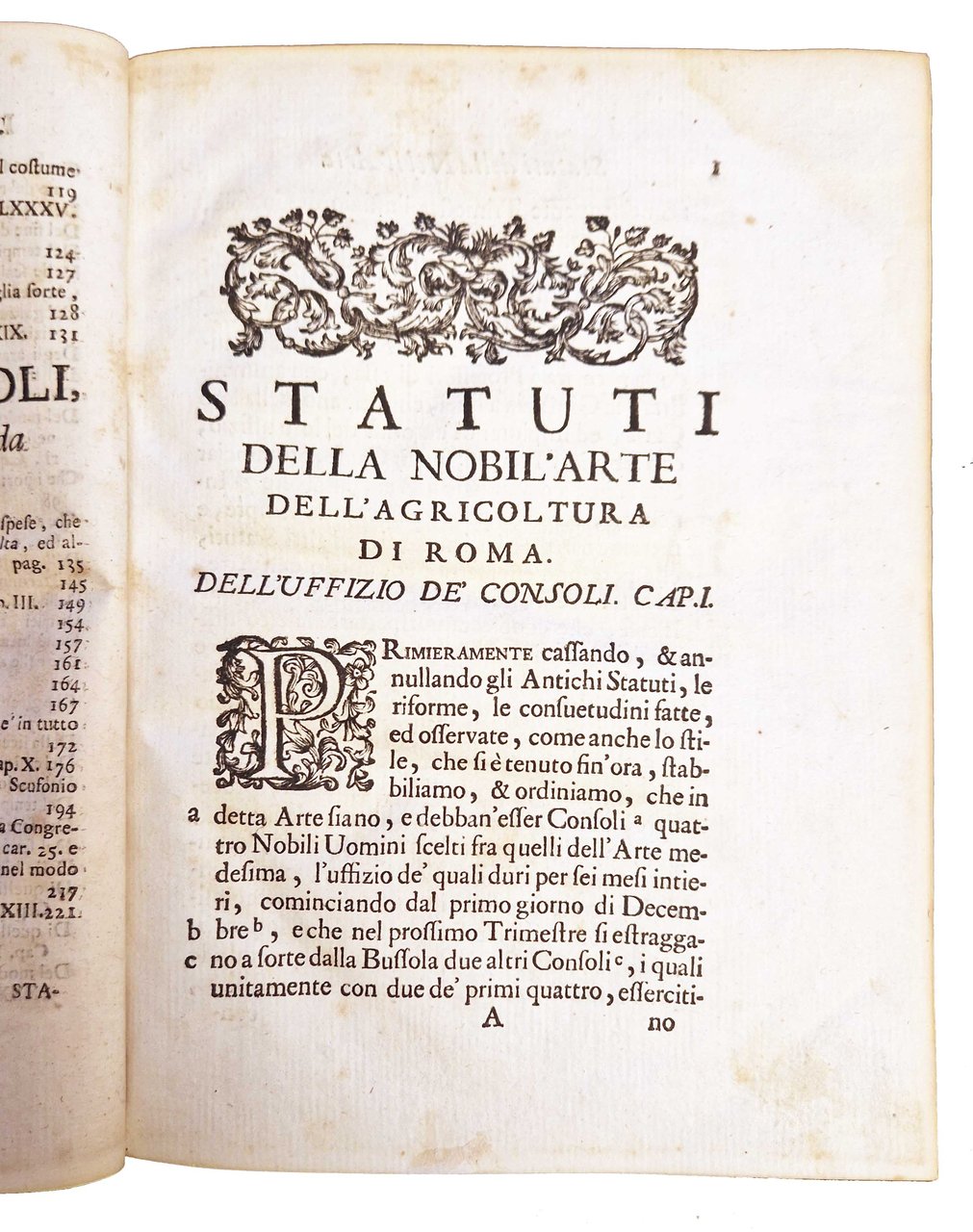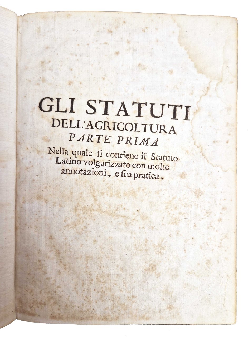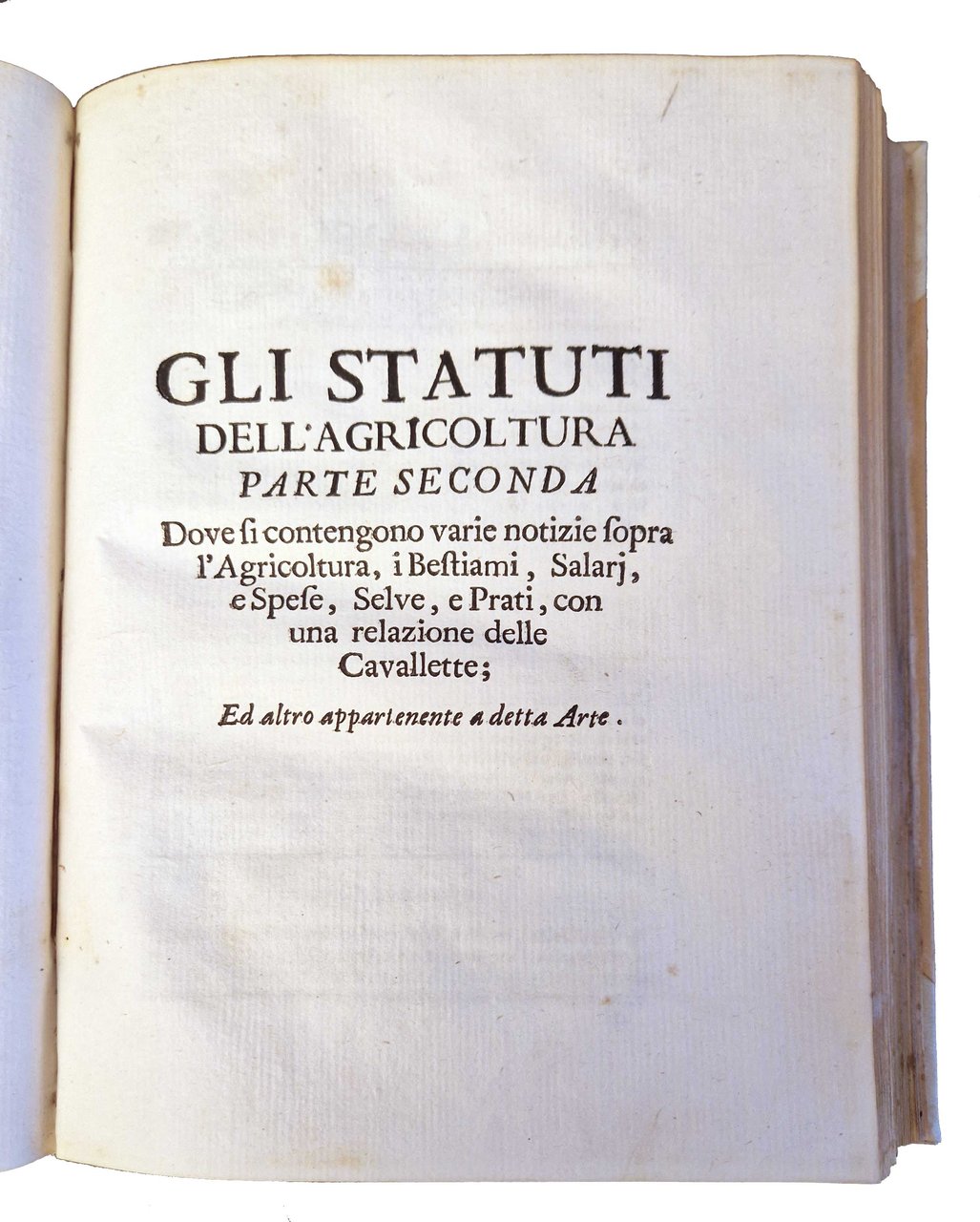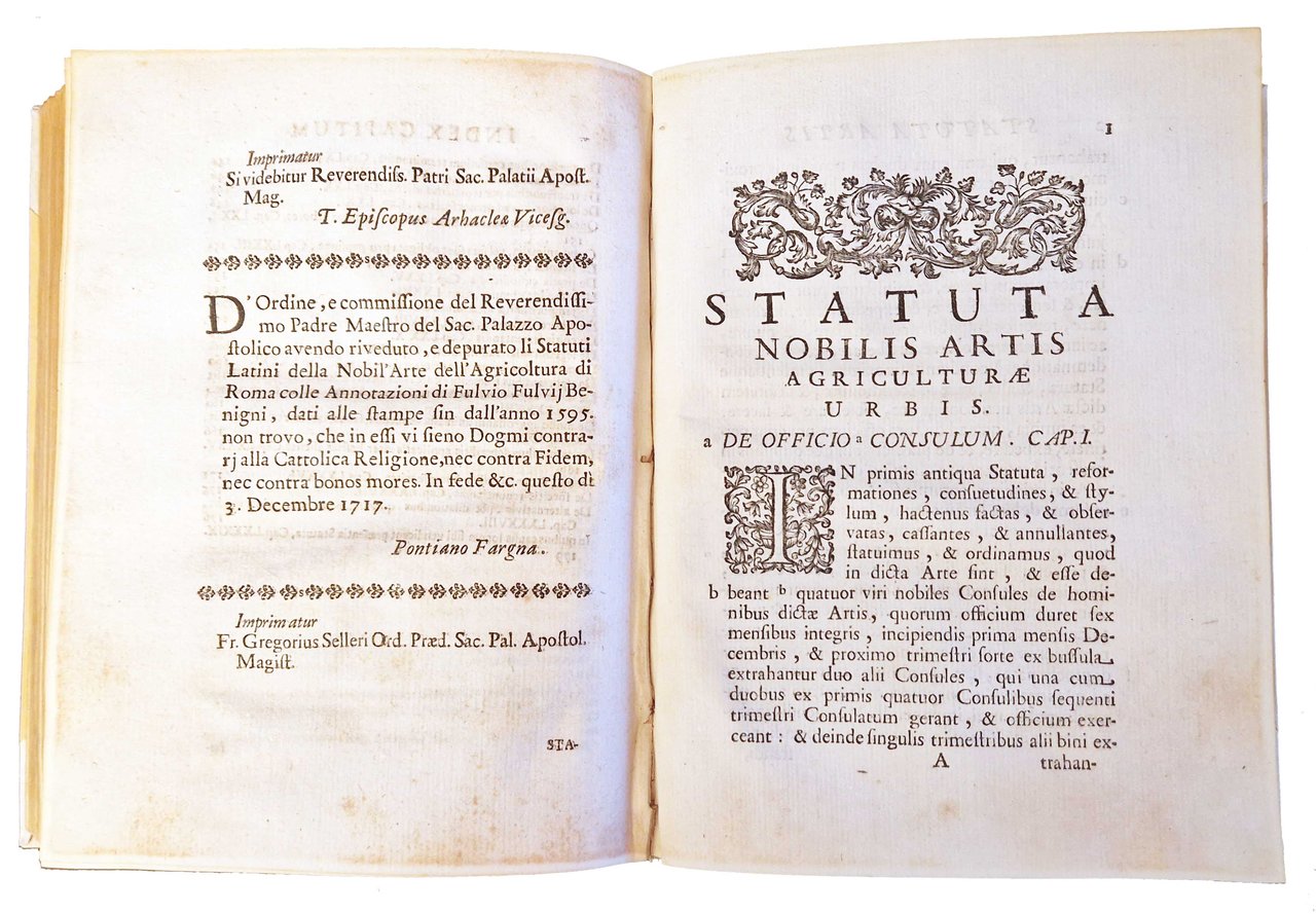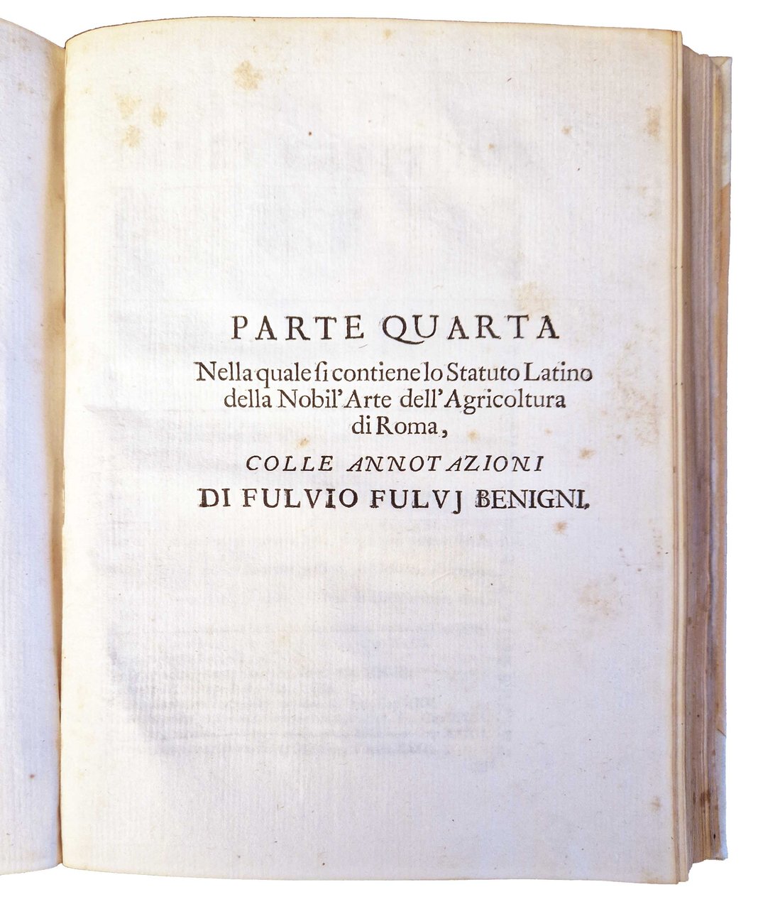 in-4°, 236x180 mm, leg. moderna rigida in mezza pergamena con angoli e carta ai piatti, titolo a caratteri dorati su tassello in pelle al dorso; pp. [16], 424, [8], 180, [28], [1] c. di tav.; antiporta calcografica incisa da Filippo Vasconi. Iniziali e fregi xilografici. Grande incisione calcografica a p. 208, raffigurante due grilli (Max. Limpach. scul.). Bianca la c. [chi]1. La c.?2 contiene l'occhietto col tit. in italiano: Parte quarta nella quale si contiene lo statuto latino della nobil'arte dell'agricoltura di Roma. "Statuta nobilis artis agriculturæ urbis pars quarta", con testo latino con annotazioni di Fulvio Fulvi Benigni. Prima edizione di questa raccolta che comprende non solo gli Statuti ma anche una serie di saggi sull'agricoltura. Prov.: Iscrizione d'appartenenza manoscritta ad inchisotro in basso al frontespizio (Joseph Molella 1757). Timbro tondo ad inchiostro sul frontespizio, appartenente ad un nobile sacerdote. Presenza di antiche annotazioni manoscritte ad inchiostro a margine del testo. Rif.: IT\ICCU\RMLE\004406. OCLC, 956049820. Cond.: Legatura quasi in ottime condizioni. Occasionale presenza di bruniture, macchie ed aloni ad alcune carte. Esemplare in condizioni generali molto buone.