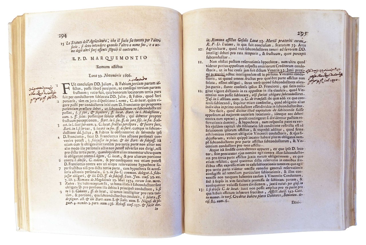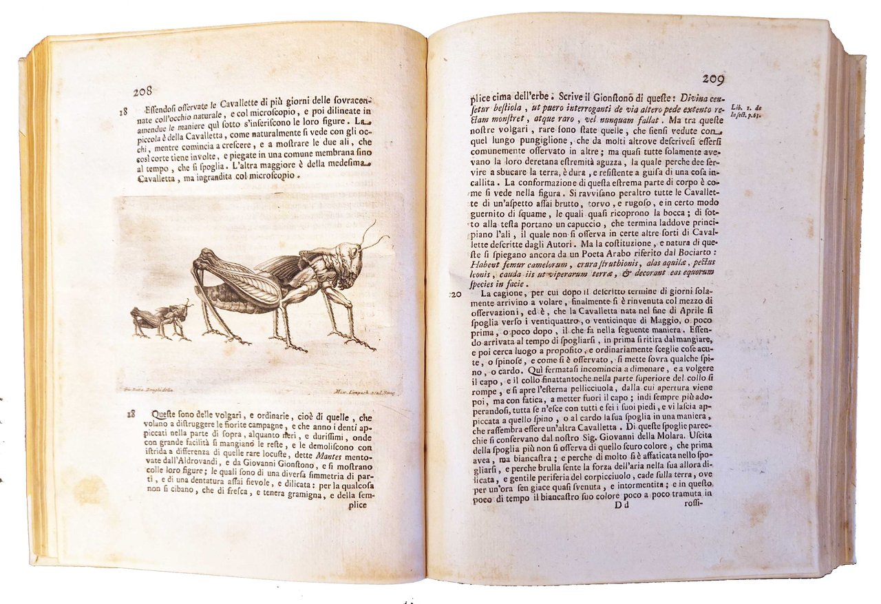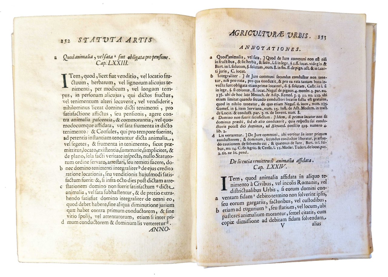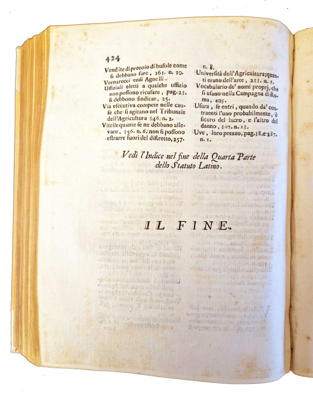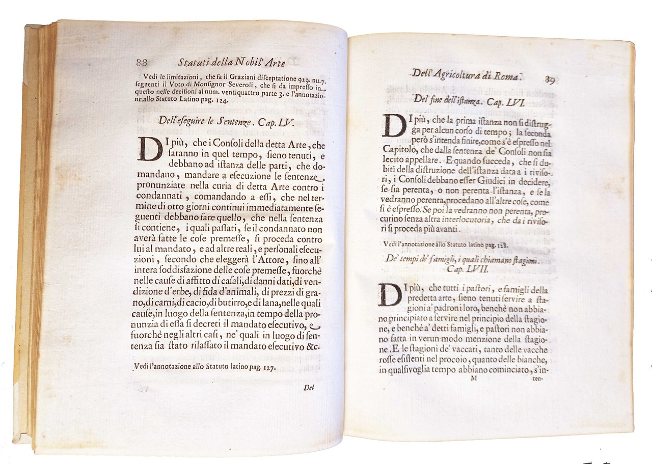 in-4°, 236x180 mm, leg. moderna rigida in mezza pergamena con angoli e carta ai piatti, titolo a caratteri dorati su tassello in pelle al dorso; pp. [16], 424, [8], 180, [28], [1] c. di tav.; antiporta calcografica incisa da Filippo Vasconi. Iniziali e fregi xilografici. Grande incisione calcografica a p. 208, raffigurante due grilli (Max. Limpach. scul.). Bianca la c. [chi]1. La c.?2 contiene l'occhietto col tit. in italiano: Parte quarta nella quale si contiene lo statuto latino della nobil'arte dell'agricoltura di Roma. "Statuta nobilis artis agriculturæ urbis pars quarta", con testo latino con annotazioni di Fulvio Fulvi Benigni. Prima edizione di questa raccolta che comprende non solo gli Statuti ma anche una serie di saggi sull'agricoltura. Prov.: Iscrizione d'appartenenza manoscritta ad inchisotro in basso al frontespizio (Joseph Molella 1757). Timbro tondo ad inchiostro sul frontespizio, appartenente ad un nobile sacerdote. Presenza di antiche annotazioni manoscritte ad inchiostro a margine del testo. Rif.: IT\ICCU\RMLE\004406. OCLC, 956049820. Cond.: Legatura quasi in ottime condizioni. Occasionale presenza di bruniture, macchie ed aloni ad alcune carte. Esemplare in condizioni generali molto buone.