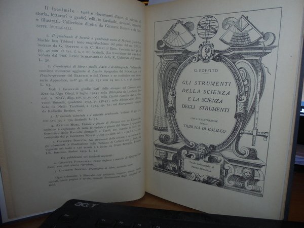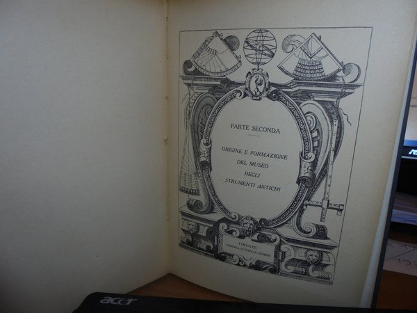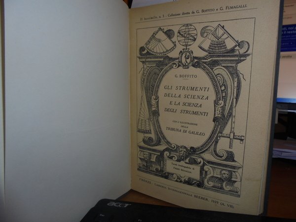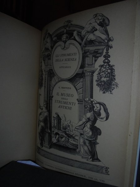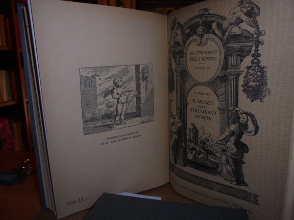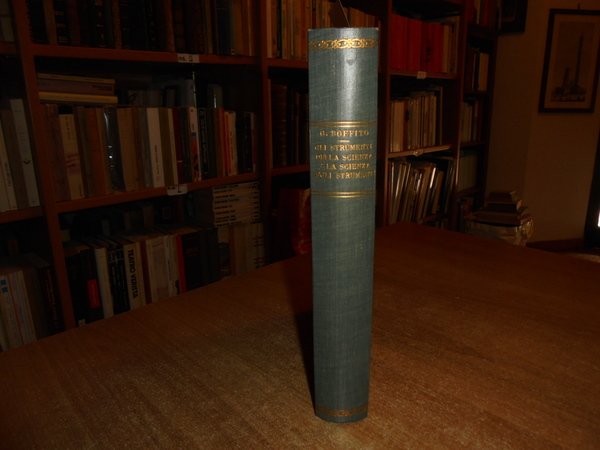 G. BOFFITO. Firenze, Libreria Internazionale Seeber, 1929/1930. Gli Strumenti della Scienza e la Scienza degli Strumenti con l' illustrazione della Tribuna di Galileo. Facsimili di Primo Benaglia. 2 parti in un volume in-8°, tela con titoli in oro al dorso, copertine originali conservate. xvi, 217 pp. con 136 tavole fuori testo. Appendice, 36, (3) pp. Ottimo esemplare in legatura recente e completo dell' appendice, rara. Uff. D - III - 1