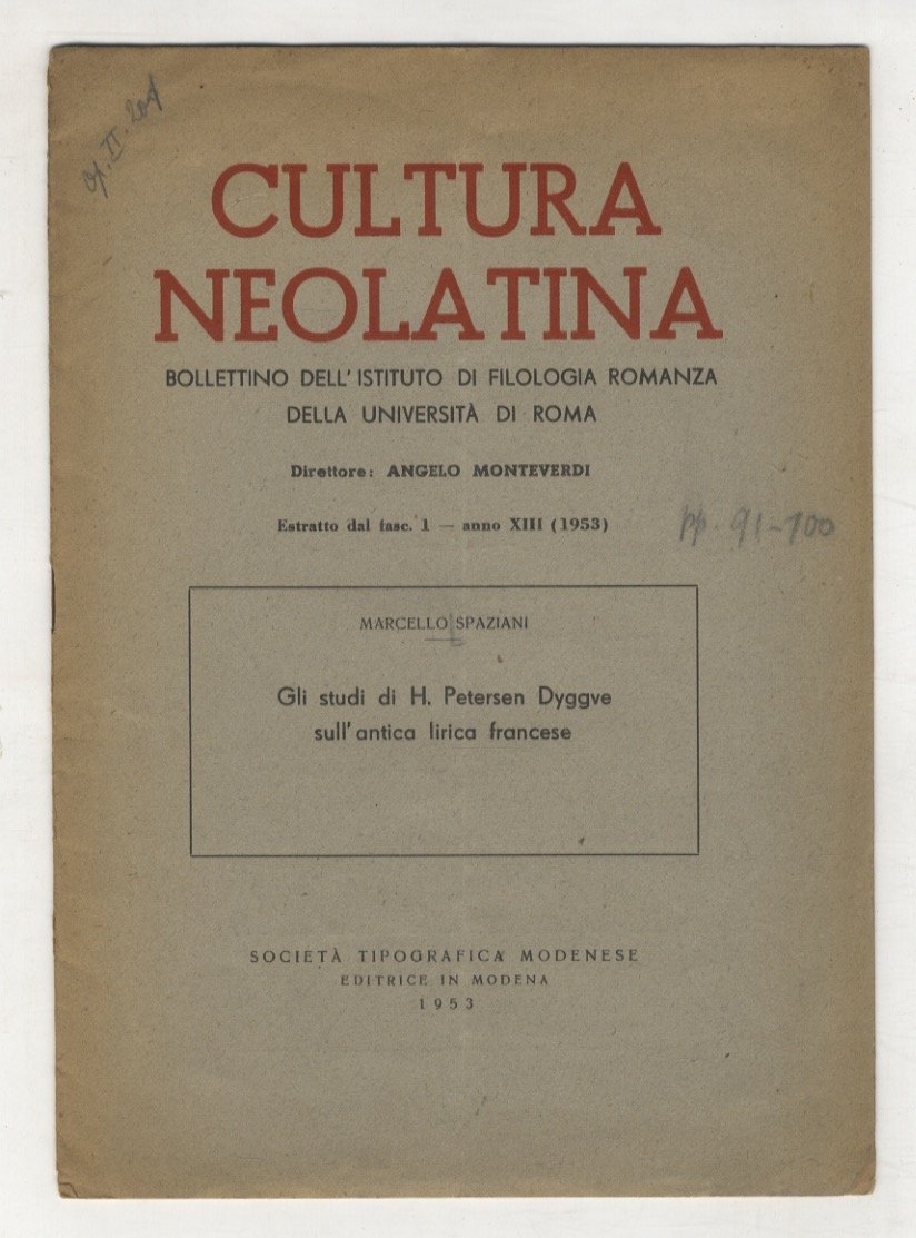 Modena, Società Tipografica Modenese, 1953, in-8, br. editoriale, pp. 10. Estratto da "Cultura neolatina, fasc. 1, anno XIII. Invio autografo dell'autore a Carlo Cordié.