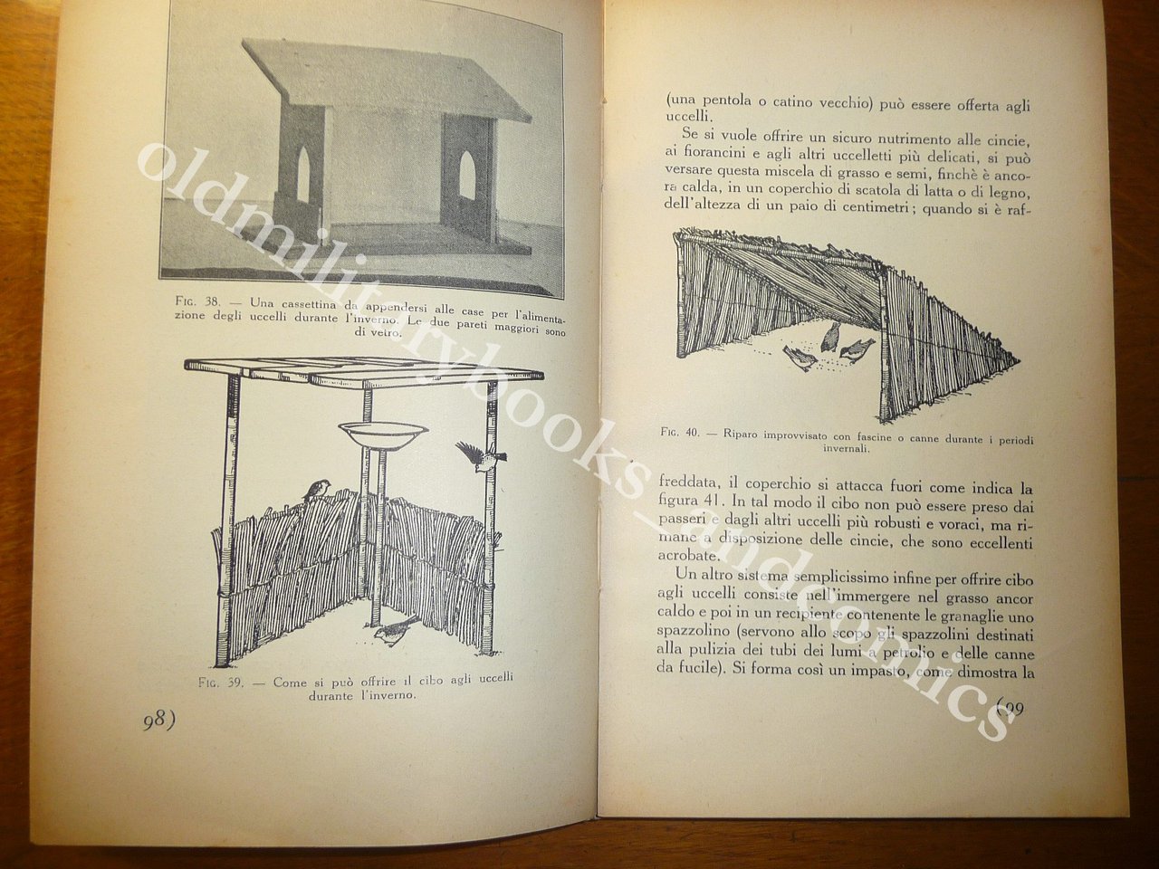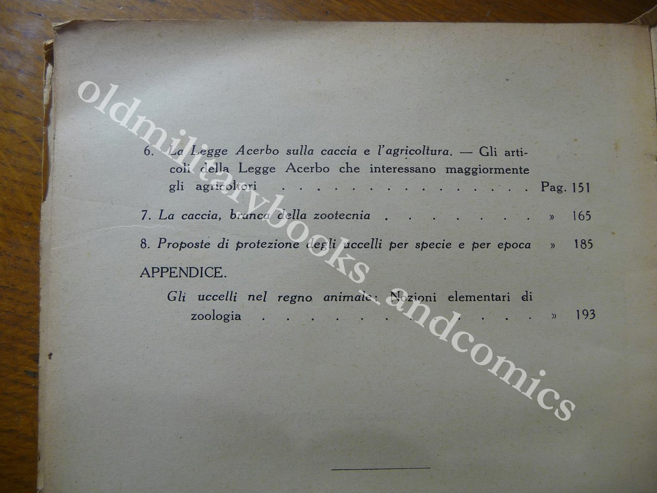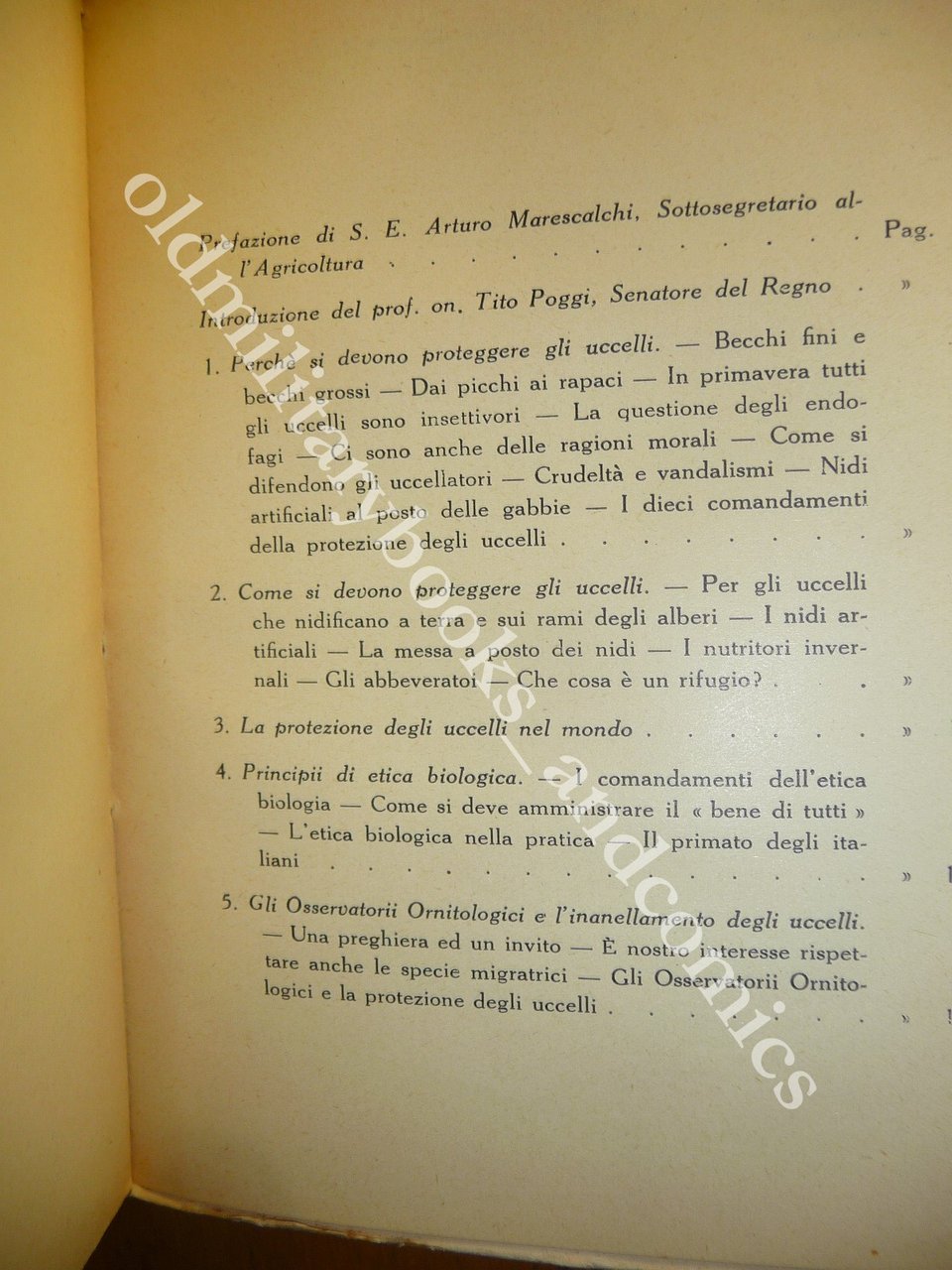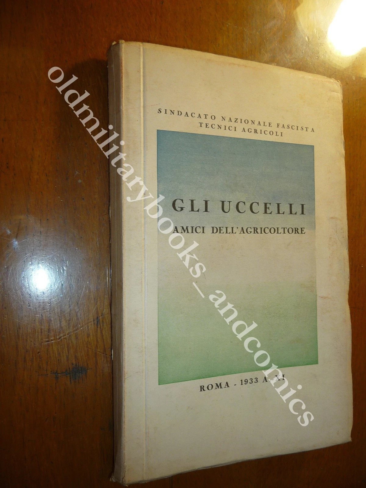 Prefazione di S. E. Arturo Marescalchi, allora Sottosegretario all'Agricoltura, e un'introduzione dell'On. Tito Poggi, figure di rilievo nell’ambito agricolo del regime fascista. Il testo si propone di illustrare e valorizzare gli uccelli utili all’agricoltore, probabilmente spiegando il ruolo benefico di molte specie di uccelli nella lotta biologica contro insetti dannosi e altri parassiti delle colture. Rappresenta uno strumento didattico e divulgativo destinato agli agricoltori, per promuovere una migliore comprensione della biodiversità utile alle pratiche agricole, riflettendo anche una politica di valorizzazione delle risorse naturali nel contesto del regime.