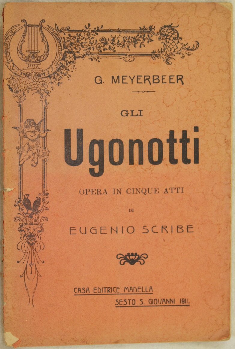 In 16. Dim. 18,5x12 cm. Pp. 32. Bel libretto d'opera del 1911 di questa nota opera ambientata durante la notte di san Bartolomeo del compositore tedesco Giacomo Meyerbeer (1791-1864) compositore tedesco. L'opera venne rappresentata per la prima volta nel 1836. In buone condizioni. Brossura editoriale in buone condizioni generali con lievi usure ai margini e dorso. Legatura in buone condizioni. All'interno le pagine si presentano in buone condizioni con rare fioriture. Beautiful booklet of 1911 of this famous work placed in the Night of Saint Barthelemy by the german composer Giacomo Meyerbeer (1791-1864. The work was represented for the first time in 1836. In good conditions. Editorial cover in good general conditions slightly worn in the edges and spine. Binding in good conditions. Inside pages are in good conditions with occasional foxings.