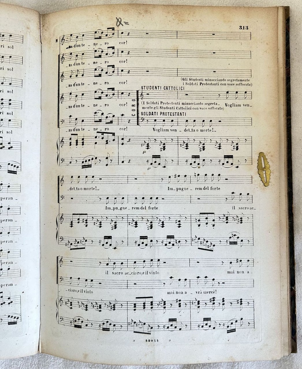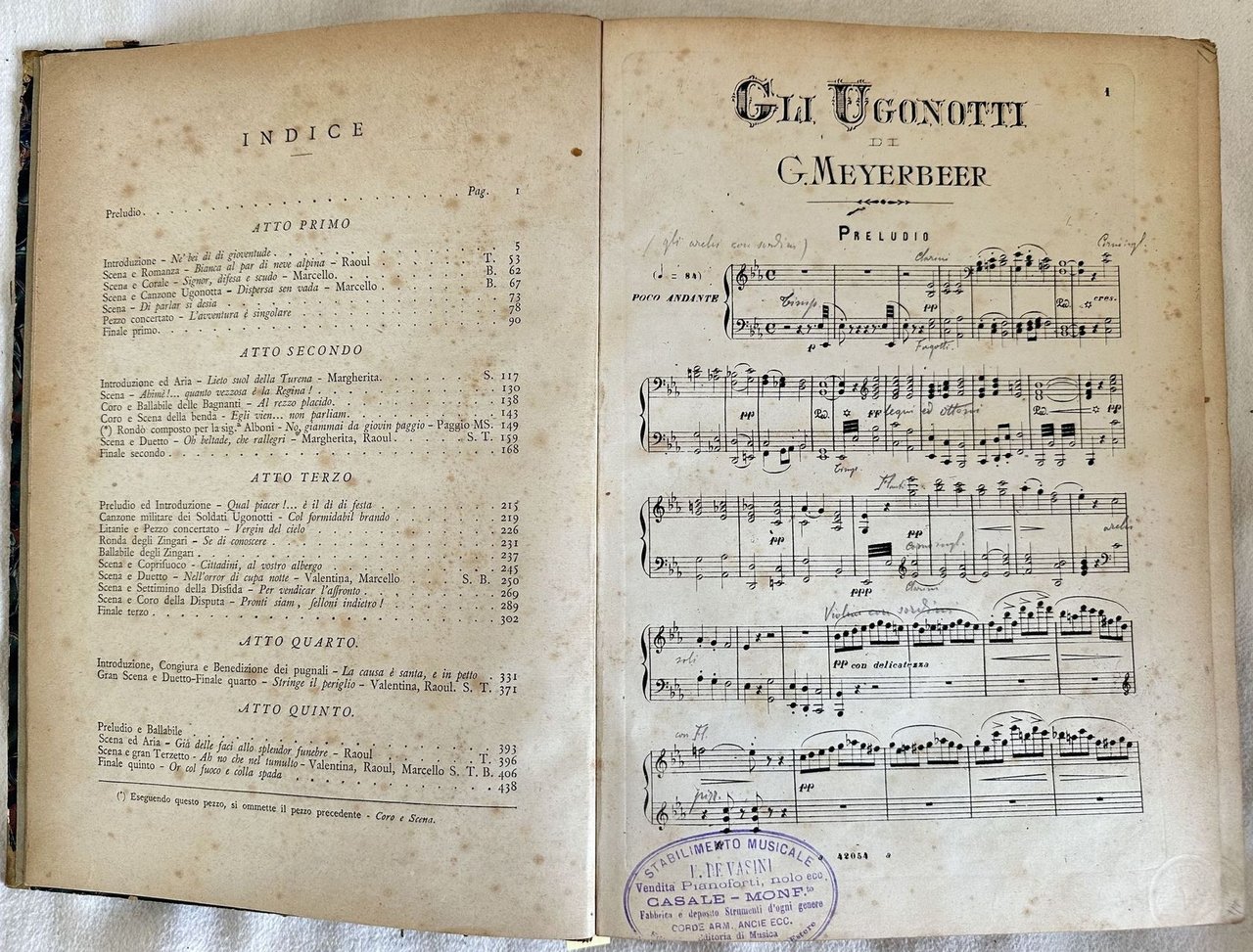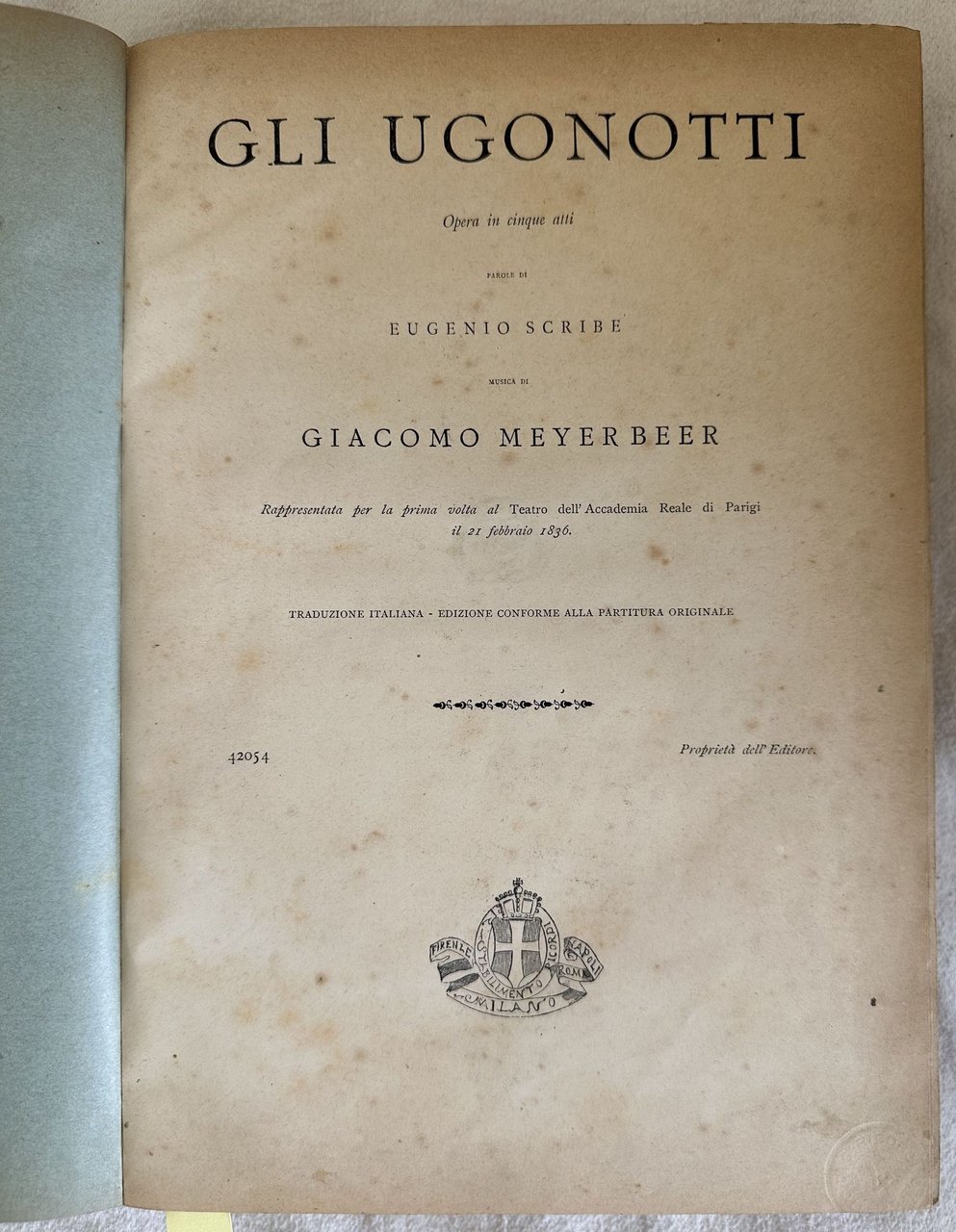 Edizione dell'aprile 1876 dello spartito della nota opera "Gli ugonotti" ambientata durante la notte di san Bartolomeo del compositore tedesco Giacomo Meyerbeer (1791-1864). L'opera venne rappresentata per la prima volta il 21 febbraio 1836 al Teatro dell'Accademia Reale di Parigi, il timbro a secco indica aprile 1876 e il numero della stampa è 42054. Indicazione degli attori (Dorus-Gras, Serda, falcon, Derivis, Dupont, Wartel, Massol, Prevost, Nourrit, Levasseur, Flecheur). Alcune pagine unite tra loro. Partitura completa per pianoforte e canto. Antiche note manoscritte a matita. Brossura editoriale illustrata. In buone condizioni. Copertina in mezza pelle con brossura editoriale applicata al piatto anteriore in buone condizioni con lievi usure ai margini e dorso. Legatura in buone condizioni. Pagine in buone condizioni con fioriture. In folio. cm. 28x21. Pp. (6)+441. Peso Kg. 1,440.Edition of april 1876 of the score of the famous work "Gli ugonotti" placed in the Night of Saint Barthelemy by the german composer Giacomo Meyerbeer (1791-1864. The work was represented for the first time the 21st of february 1836 in the Teatro dell'Accademia Reale di Parigi, the embossed stamp indicates april 1876 and the number in the page is 42054. Indication of actors (Dorus-Gras, Serda, falcon, Derivis, Dupont, Wartel, Massol, Prevost, Nourrit, Levasseur, Flecheur). Some pages bound together. Complete score for piano and chant. Antique handwritten notes in pencil. Editorial illustrated cover. In good conditions. Half leather cover with editorial cover applied in front plate in good conditions lightly worn in the extremities and spine. Binding inb good conditions. Pages in good conditions with foxing. In folio. cm. 28x21. Pp. (6)+441. Weight Kg. 1,440.