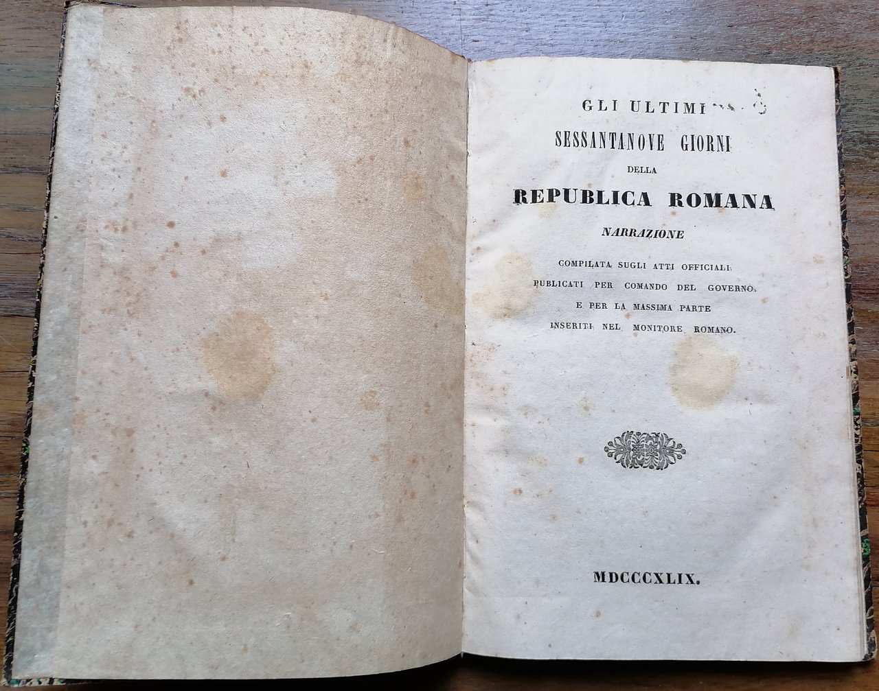 (Repubblica Romana del 1849) In 8°, legatura coeva in cartone rigido rivestito di carta decorata, pp. 112. Tracce di ossidazione alle carte di guardia ed al frontespizio, peraltro ottimo stato di conservazione.