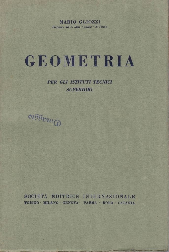 Mario Gliozzi, Geometria per gli istituti tecnici superiori, Società Editrice Internazionale, Torino 1941, pp. 173, ill. b.n., cm 23, br. ed. Timbro Omaggio alla prima di copertina. Perfetto.