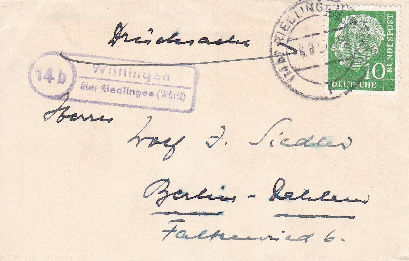 Das Kärtchen mit Glückwünschen des Ehepaars Jünger richtet sich an den für die alte Bundesrepublik bedeutenden Essayisten und Verleger Wolf Jobst Siedler. Siedler war seit etwa Anfang der 1960er Jahre als konservativ-kritischer Journalist, Essayist und Verleger in Westberlin tätig. Insbesondere seine spätere verlegerische Tätigkeit im Siedler Verlag machte ihn für viele Menschen in der BRD zu einem bedeutenden Zeitgenossen. Das Kärtchen enthält den Aufdruck "Ernst und Gretha Jünger" samt deren Anschrift in Wilflingen. Handschriftlich wurden Umschlag und Karte von Gretha Jünger beschrieben. Auf dem Kärtchen ist "Mit herzlichen Glückwünschen!" geschrieben. Das Kärtchen befindet sich noch im Original-Briefumschlag. Dieser wurde von Jünger mit den Adressdaten Siedlers in Berlin (West) beschrieben, sowie Namenszug und Wilflinger Anschrift auf der Rückseite. Der Brief ist gelaufen (Datum: "8.8.5_") und enthält noch die gestempelte grüne Briefmarke mit dem Theodor Heuss-Porträt. Zu welchem Anlaß das Ehepaar Jünger dem hier erst 32 jährigen Siedler gratulierte ist unbekannt, womöglich zu einem seiner frühen journalistischen Erfolge in den 1950er Jahren. Die Bindung zwischen Jüngers und Siedler ging über berufliche Berührungspunkte weit hinaus, denn der junge Siedler war einst ein Freund des Sohnes von Ernst Jünger ("Ernstel"). Dieser starb im späteren Kriegsverlauf mit jungen Jahren. Der spätere Verleger Siedler war also seit den 1940er Jahren der ganzen Familie Jünger verbunden und zeitlebens eine lebende Verbindung zum gefallenen Sohn. Unikat aus der lebenslangen Verbindung von Wolf Jobst Siedler mit dem Schriftsteller Ernst Jünger!