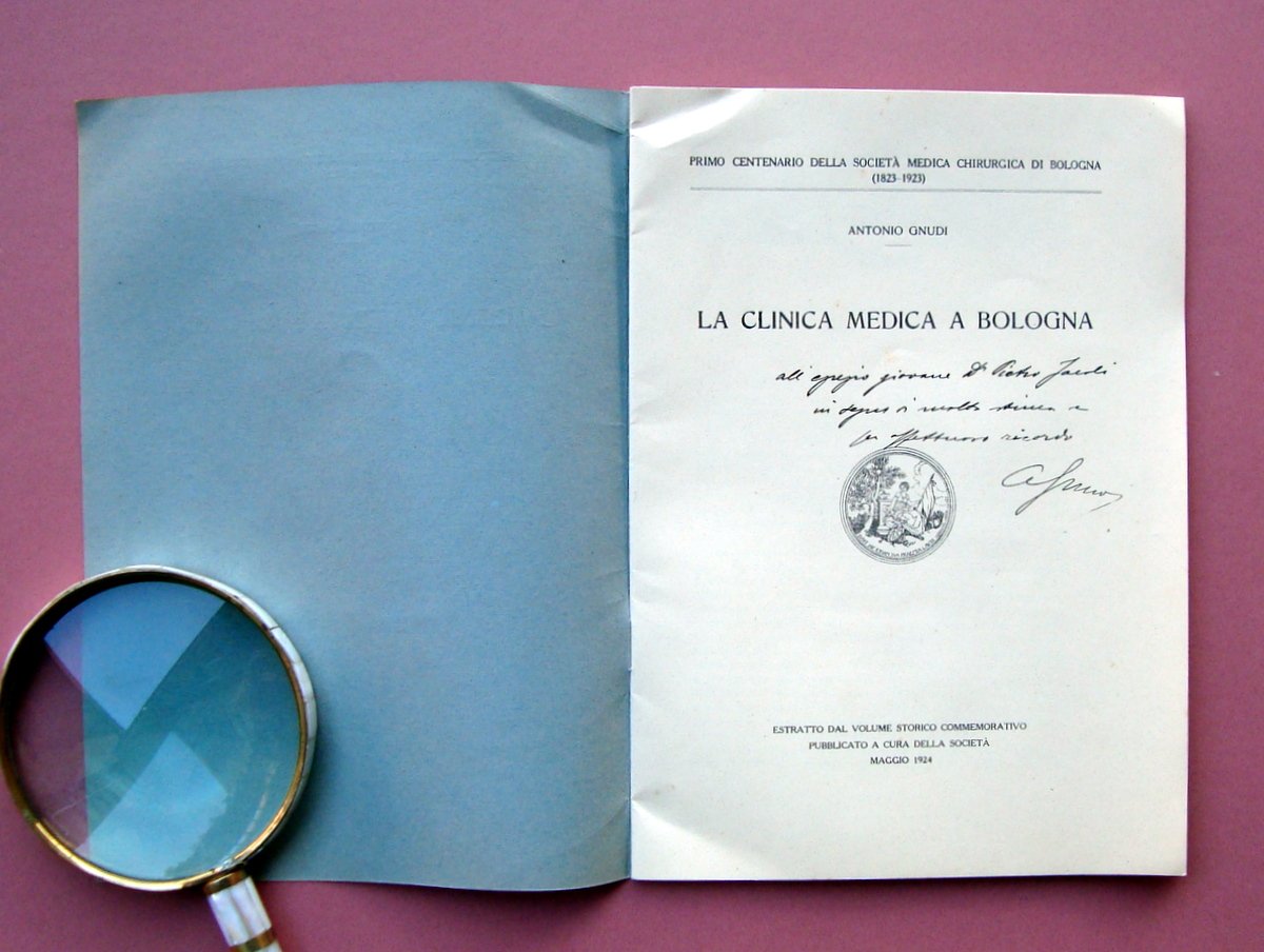 Gnudi A., La Clinica Medica a Bologna Stab Pol. Riuniti, Bologna, 1924; cm 25,5x18,5; pp.19; br. ed. con decia e firma autografe dell'autore al frontespizio (vedi foto). Condizioni di conservazione Esemplare in buone condizioni con tracce d'uso e del tempo; br. ant. con scoloriture; leggere ammaccature alle cuffie del dorso. Societas medico Chirurgica Bononiensis OPEB.5385 blu
