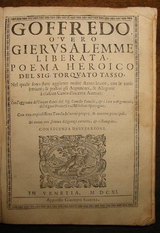 Goffredo, overo Gierusalemme liberata, poema heroico. Nel quale sono state aggiunte molte stanze levate, con le varie lettioni; & postivi gli Argomenti, & Allegorie a’ ciascun Canto d’incerto Auttore. Con l’aggiunta de’ Cinque Canti del Sig. Camillo Camilli, & i loro Argomenti, del Sig. Francesco Melchiori Opitergino.