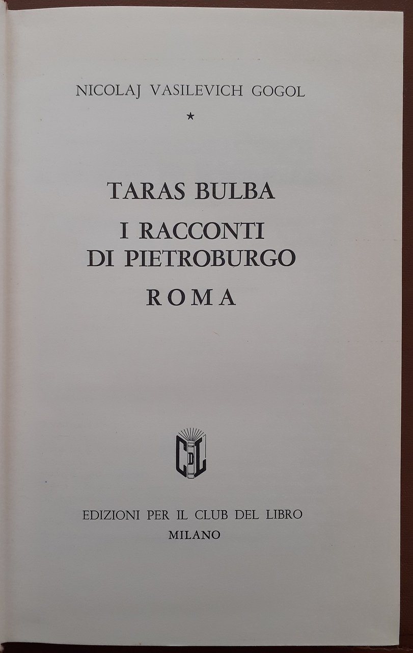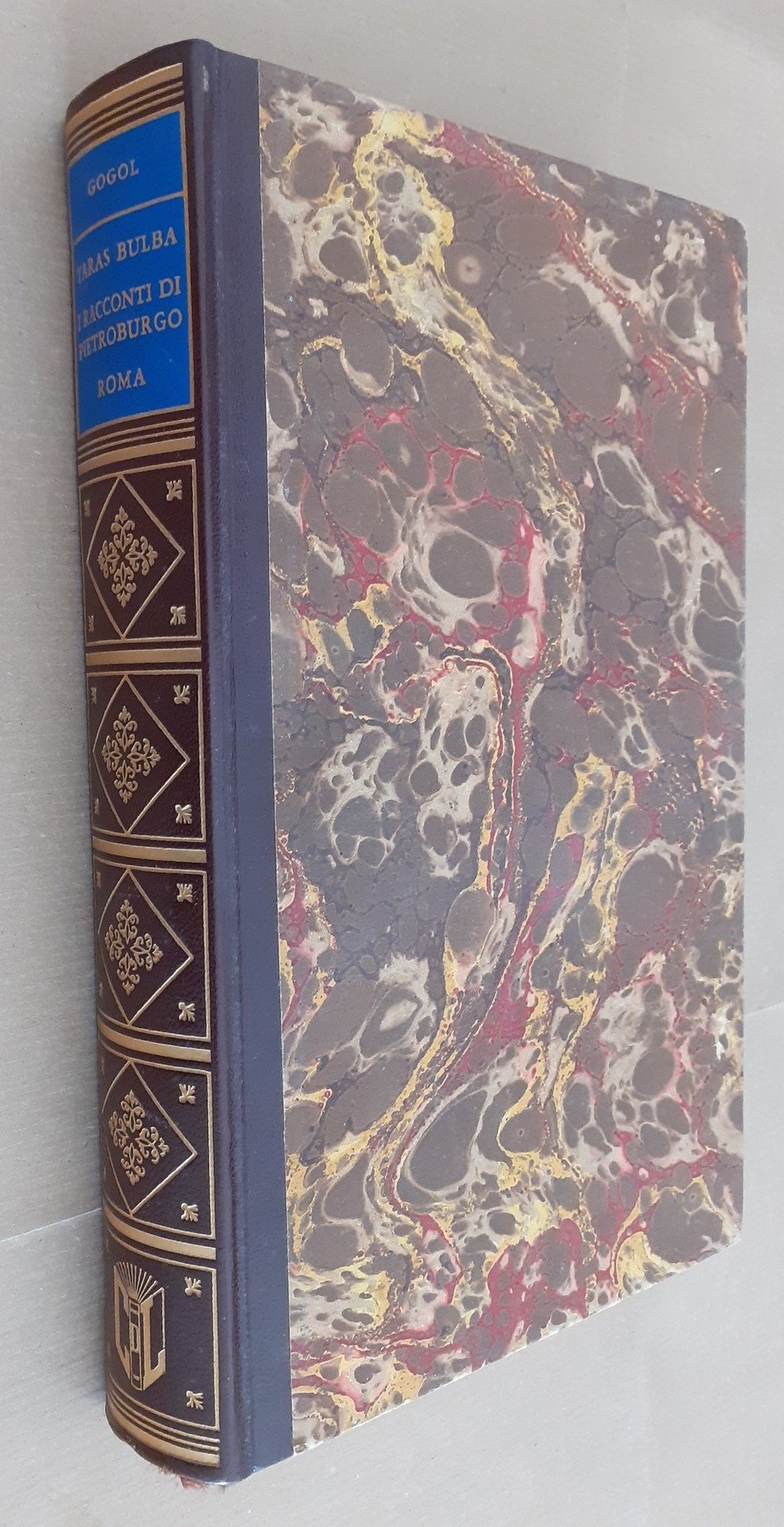 Nicolaj Vasilevich Gogol, Taras Bulba I racconti di Pietroburgo Roma, Edizioni per il Club del Libro, Milano 1963, pp. 417, cm 22, legatura in mezza similpelle ed. con titoli e fregi al dorso e piatti in carta marmorizzata. Collana dei grandi narratori, vol. 26. Esemplare n. A0207. Una piccolissima abrasione all’interno del piatto anteriore, minime fioriture ai tagli, lievissima brunitura della carta, per il resto ottimo esemplare.