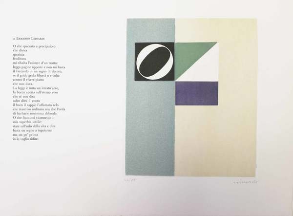 Astuccio edit. oblungo (mm. 304x411) contenente una cartella con 6 fogli nn. e 4 pregevoli tavole incise all'acquaforte e all'acquatinta di: Lucio Battaglia - Maria Luisa de Romans - Ermanno Leinardi - Walter Valentini, numerate e firmate dai vari artisti, a ciascuno dei quali il Mascioni ha dedicato una poesia (stampata sul lato sinistro di ogni tavola). La poesia Gold Standard che da il titolo al libro, è stampata all'inizio; alla fine, tutte le 5 poesie sono riportate in traduzione tedesca. Tiratura di complessivi 135 esemplari, su carta Bfk Rives. Il ns., 46, fa parte della tiratura di 85 ed è in ottimo stato.