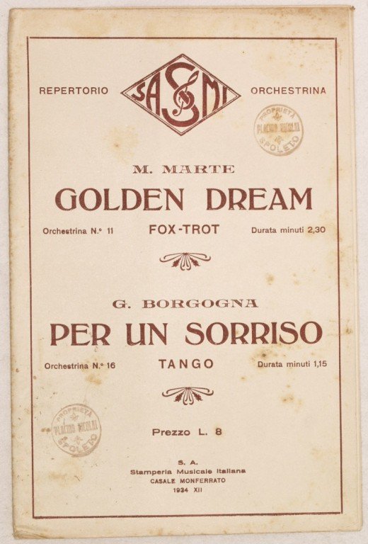 In 8. cm 26,5x18. Pp. 30. partitura completa per orchestra del 1934 di due canzoni. Ex libris sulla copertina ed in qualche pagina. Ottime condizioni. a complete score for orchestra of 1934. Carachteristic decorated cover of that period. Ex libris in the cover and in some pages. Very good conditions.