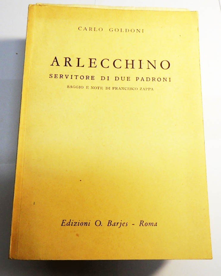 Carlo Goldoni, Arlecchino servitore di due padroni, saggio e note di Francesco Zappa, Edizioni O. Barjes, Roma s.d. (1953?), pp, XXX, 96, cm 20, br. ed. Timbro “Saggio” alla terza di copertina. Un segno di biro alla prima pagina di testo, per il resto perfetto.