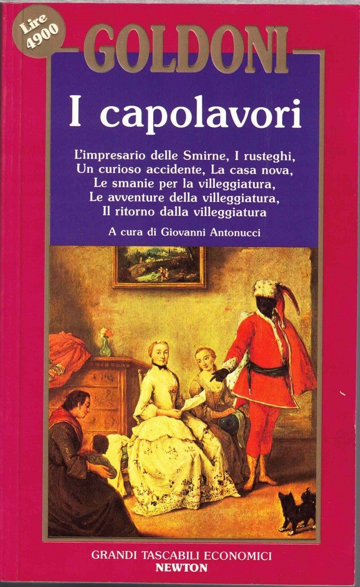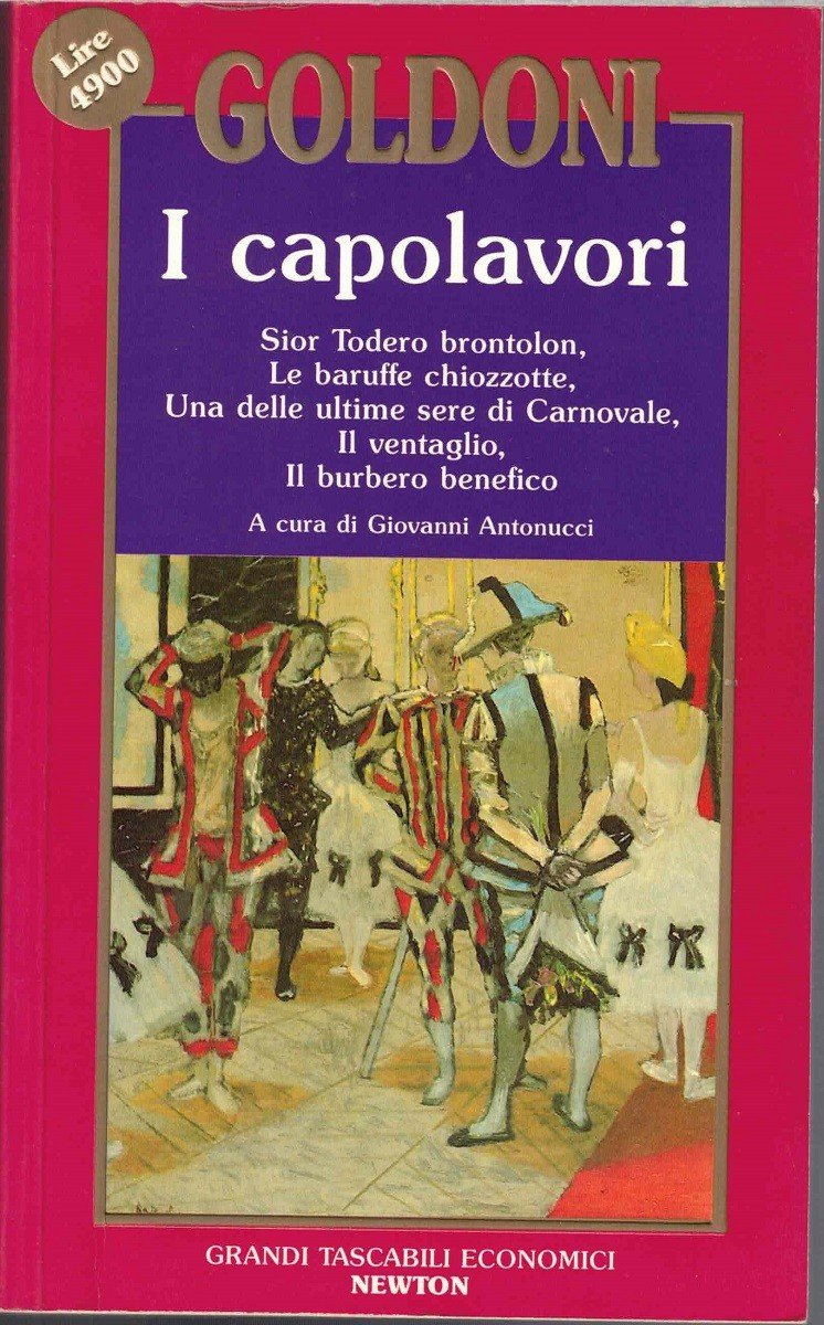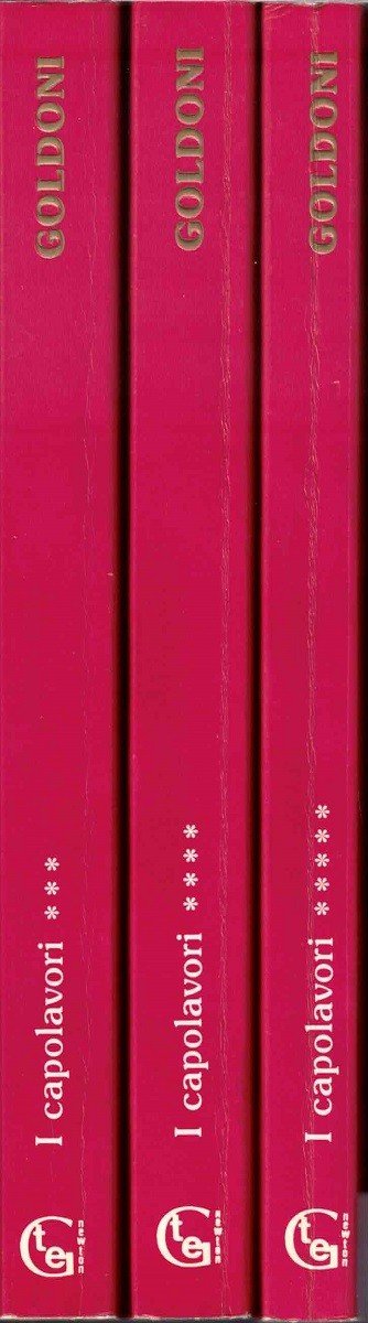 Carlo Goldoni, I capolavori, a cura di Giovanni Antonucci, Newton Compton editori, Roma 1992, prima ed. Grandi Tascabili Economici Newton, 3 voll. (voll. 3-5), pp. totali 1121, cm 22, br. ed. Collana Grandi Tascabili Economici Newton, voll. 158-160 (volumi 3, 4 e 5 de I capolavori di Carlo Goldoni). Volume terzo: Le massere, Le donne de casa soa, Il campiello, Le morbinose, L’apatista, Gl’innamorati, pp. 394. Volume quarto: L’impresario delle Smirne, I rusteghi, Un curioso accidente, La casa nova, Le smanie per la villeggiatura, Le avventure della villeggiatura, Il ritorno dalla villeggiatura, pp. 412. Volume quinto: Sior Todero brontolon, Le baruffe chiozzotte, Una delle ultime sere di Carnovale, Il ventaglio, Il burbero benefino, pp. 315. Piccola firma d’appartenenza al frontespizio del quarto volume. Lievi tracce d’uso, minima ingiallitura della carta, per il resto volumi ben conservati.