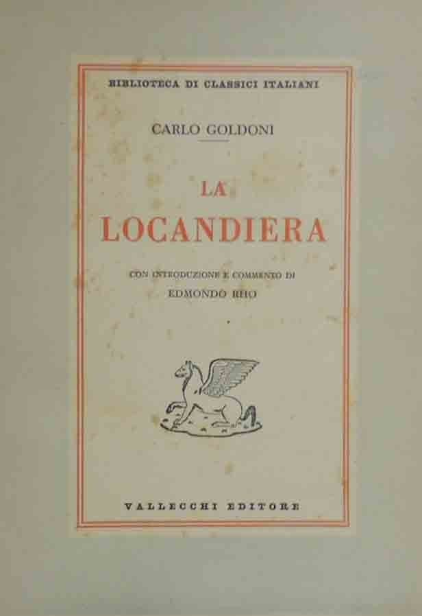 Carlo Goldoni, La locandiera, con introduzione e commento di Giorgio Rho, Vallecchi Editore, s.l. (ma stampato a Firenze, presso gli Stabilimenti Grafici Vallecchi) 1949, pp. 137, 2 c. di tavv. f.t. ill. b.n., cm 20, br. ed. Collana Biblioteca di classici italiani All’occhielo, firma d’appartenenza e numero progressivo di classificazione. Leggere tracce d’uso al dorso, fioriture, minima brunitura della carta, ma nel complesso buona copia.