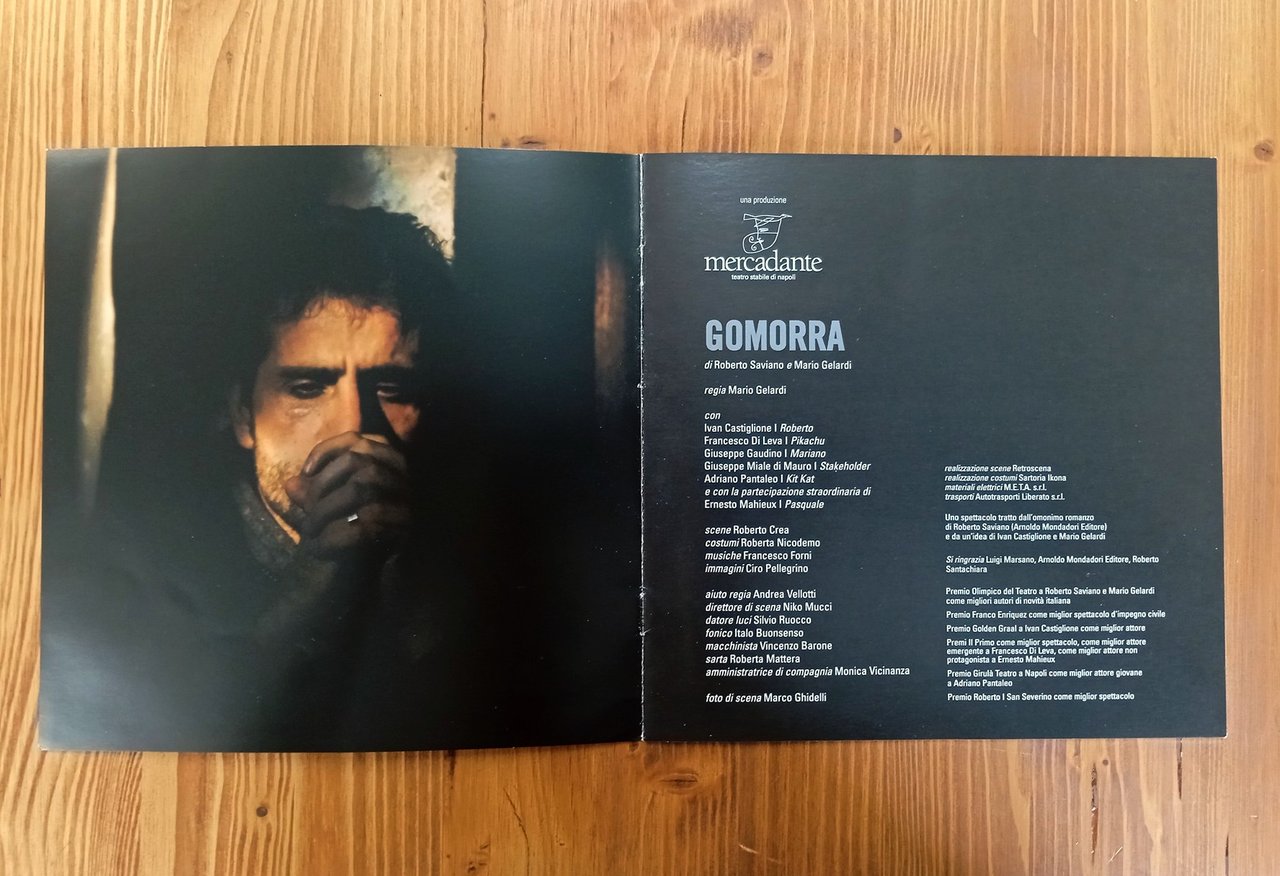 Libretto di presentazione dello spettacolo teatrale "Gomorra" di Roberto Saviano e Mario Gelardi, per la regia di Mario Gelardi, prodotto da Mercadante - Teatro stabile di Napoli -- Brossura rilegata a punto metallico, 12 pagine con illustrazioni a colori; ivi riportate le date della tournée 2008/2009 in tutta Italia; un breve testo di Enzo Biagi e due testi degli autori. Esemplare in ottime condizioni.