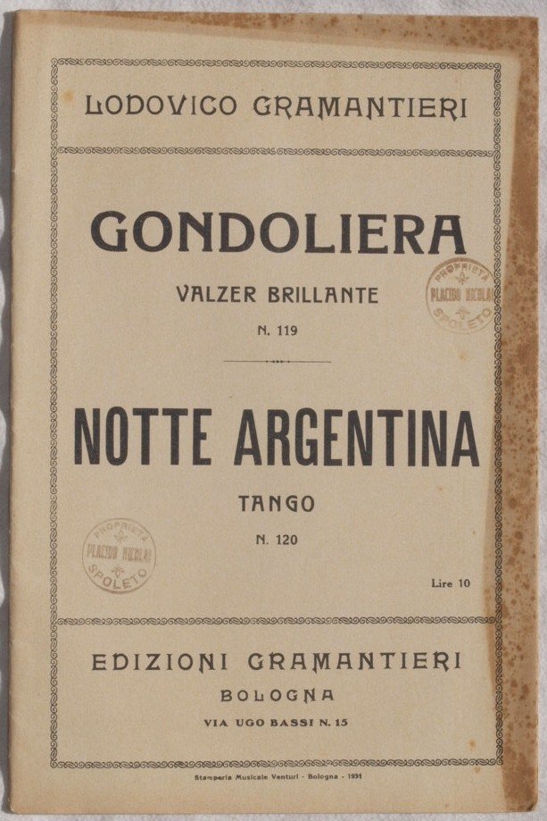 Bello spartito, partitura completa per orchestra del 1931 di due canzoni. Caratteristica copertina d'epoca. GENERE: Valzer, tango STRUMENTI: pianoforte; violino; cello; contrabbasso; sassofono; tromba; trombone; flauto; clarinetto; batteria ANNO: 1931 DIMENSIONI: In 8. cm 27x18. PAGINE: pp. 27 CONDIZIONI: Ottime condizioni NOTE: Ex libris sulla copertina ed in qualche pagina Beautiful score of one song, a complete score for orchestra of 1931. Carachteristic decorated cover of that period MUSIC: Waltz, tango STRUMENTI: piano; violin; cello; contrabbass; saxophone; trumpet; trombone; flute; clarinet; drums YEAR: 1931 SIZE: In 8. cm 27x18. PAGES: pp. 27 CONDITIONS: Very good conditions NOTES: Ex libris in the cover and in some pages