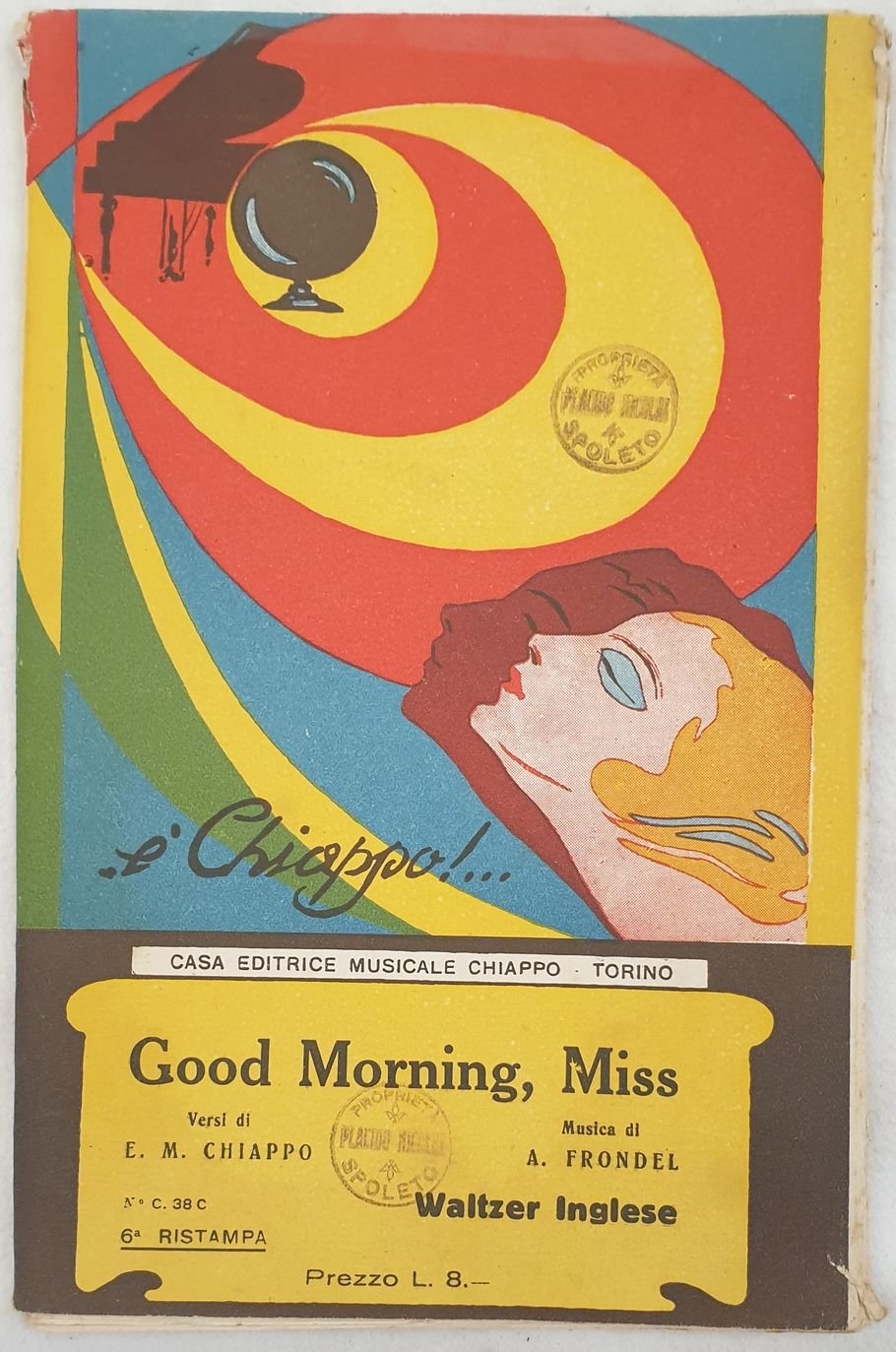Partitura per orchestra del 1930 della melodia "Good morning Miss" di A. Frondel.<BR>Copertina morbida editoriale. GENERE: Valzer STRUMENTI: pianoforte, violino, cello, tromba, basso, sassofono, clarinetto, banjo, batteria<BR>ANNO: 1930 DIMENSIONI: In 8. cm 27x18<BR>PAGINE: pp. 26 CONDIZIONI: Otime condizioni. Ex libris in copertina. Complete score for orchestra of 1930's of the melody "La sghiarola" by Garbolino and Fusco. Editorial soft cover. MUSIC: One step STRUMENTI: piano, violin, cello, trumpet ,saxophone, clarinet, banjo, drums<BR>YEAR: 1930 SIZE: In 8. cm 27x18 PAGES: pp. 26 CONDITIONS: Very good conditions. Ex libris in the cover