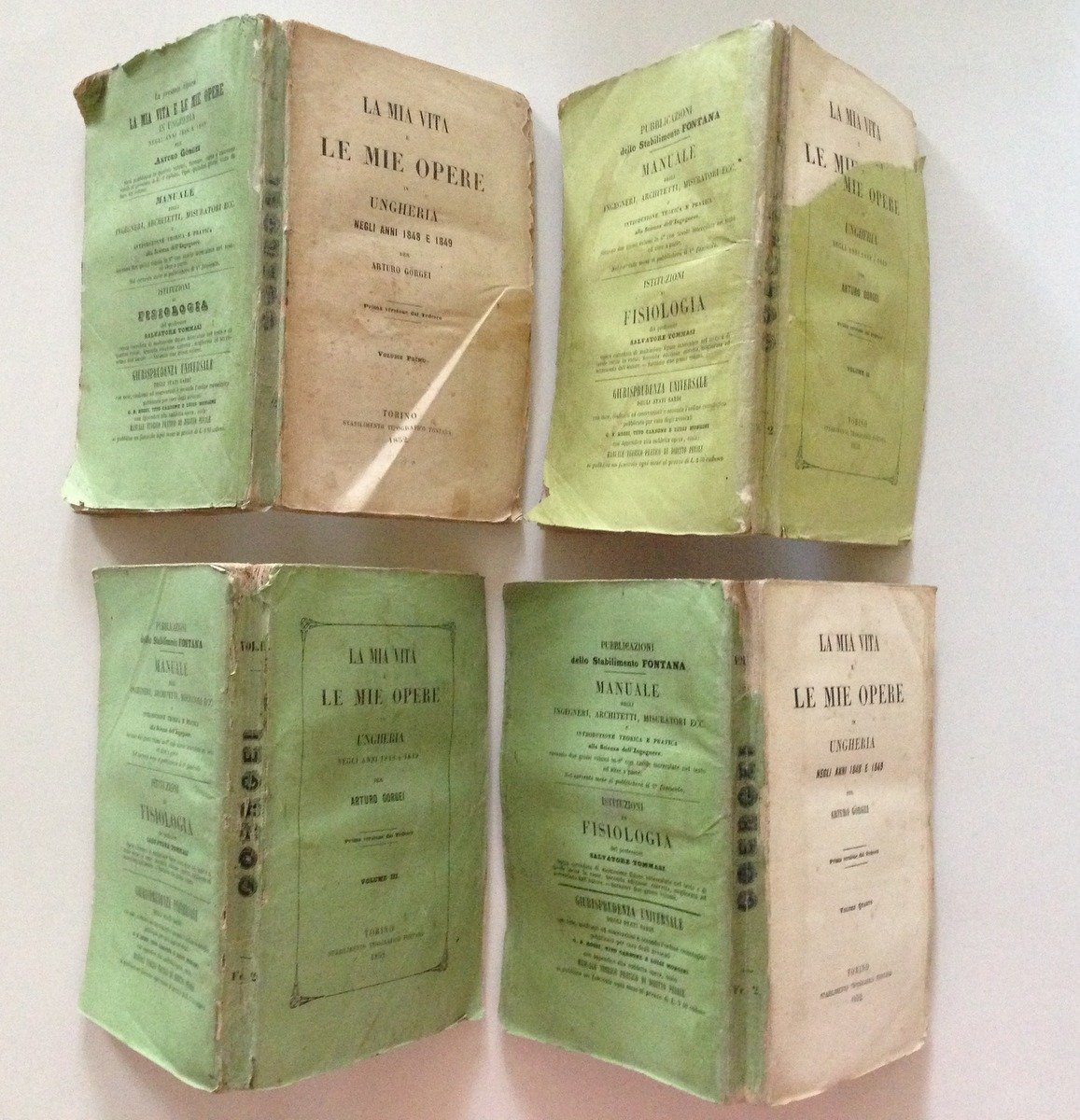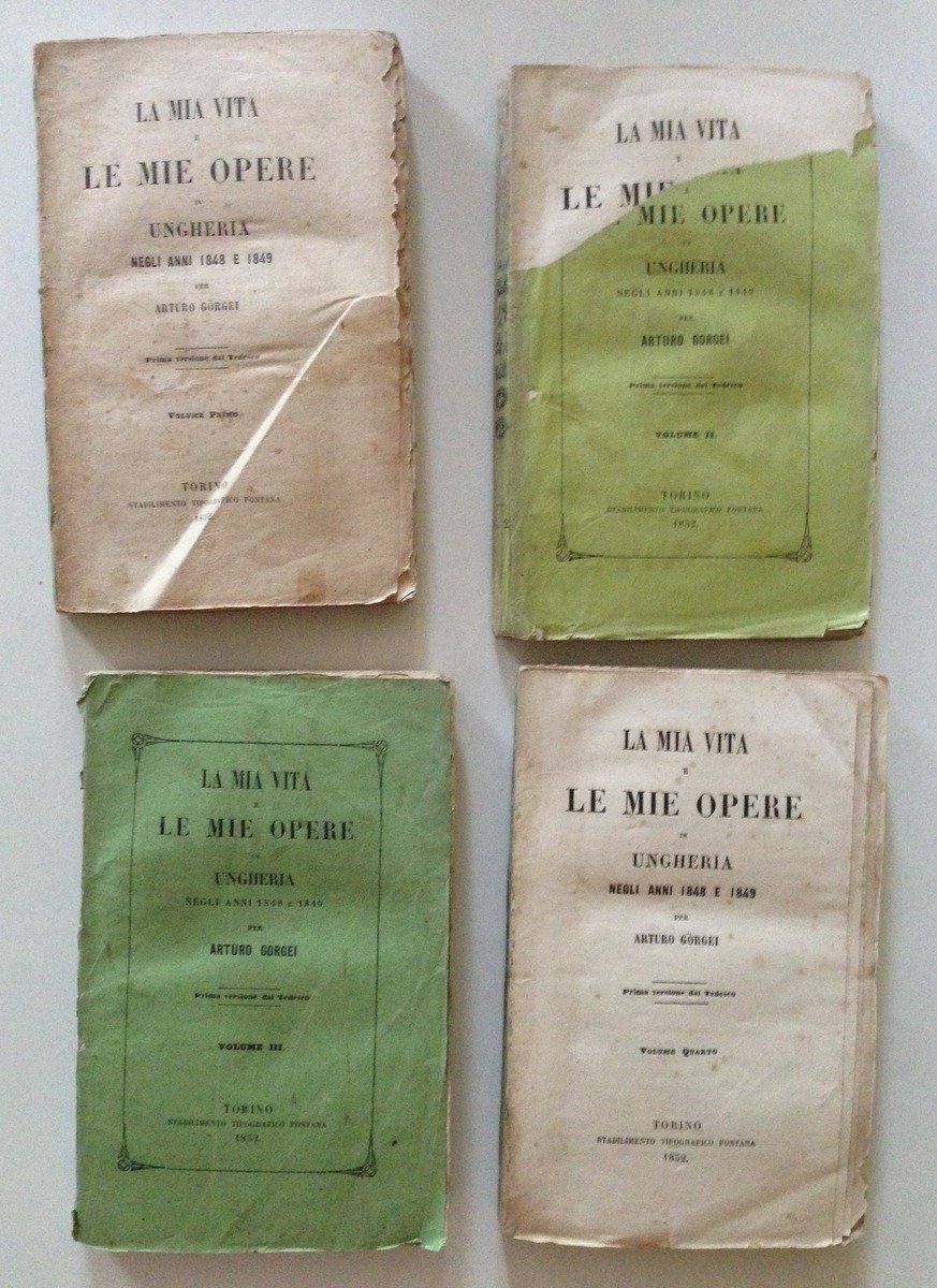 GORGEI ARTURO, LA MIA VITA E LE MIE OPERE IN UNGHERIA NEGLI ANNI 1848 E 1849 - 4 volumi - TORINO, FONTANA, 1852, 4 voll. in 16°, pp. XV+222; 235; 331; 304, opera completa (versione dal tedesco), br. ed. Condizioni di conservazione Esemplari in buono stato con tracce d'uso; brossure editoriali con alcuni strappetti e pieghette ai margini, agli angoli e ai dorsi; vol. 1 è senza brossura anteriore; vol. 2 manca parte della brossura anteriore; vol. 4 solo brossura posteriore; dorsi restaurati con carta gispponese con alcune mancanze; interni buoni e saldi. MM1084.E2-86