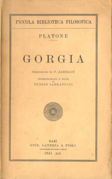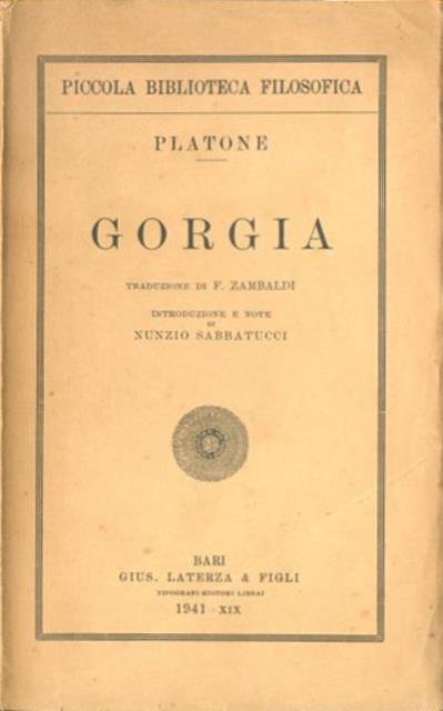 156 p. ; 20 x 13 cm. Piccola biblioteca filosofica. Il Gorgia (Γοργίας) è un dialogo di Platone risalente al gruppo dei dialoghi giovanili, e scritto probabilmente attorno al 386 a.C., al ritorno del filosofo dal suo primo viaggio in Sicilia. Esso prende il titolo dal primo e più noto interlocutore che Socrate incontra in questo dialogo, il retore Gorgia di Leontini. Traduzione di F. Zambaldi, introduzione e note di Nunzio Sabbatucci. Brossura editoriale, coperta in cartoncino flessibile, leggero ingiallimento della carta. Codice libreria 1369.