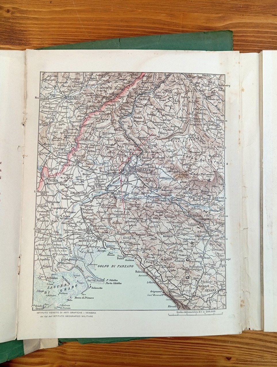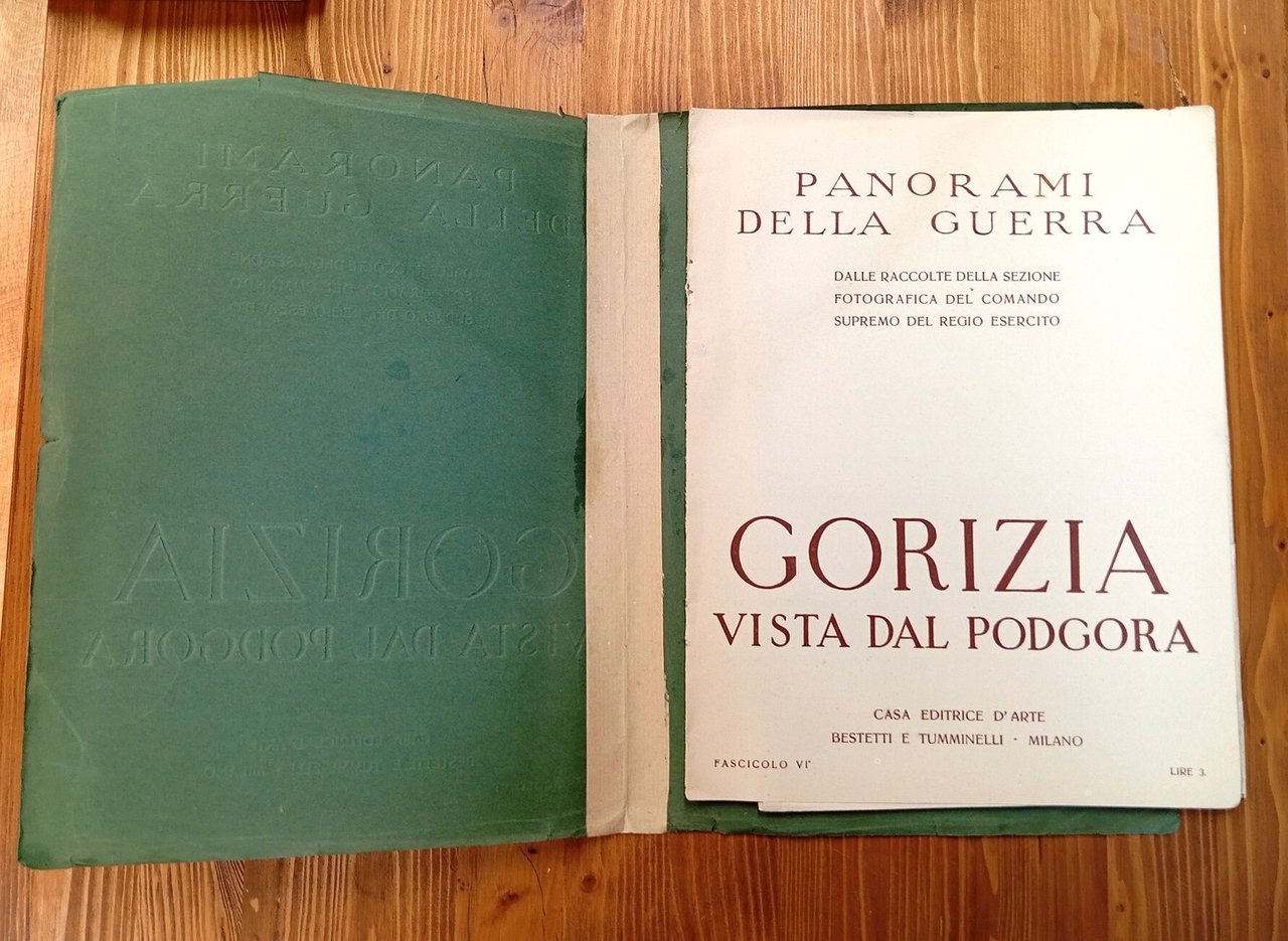 Collana "Panorami della guerra - dalle raccolte della sezione fotografica del Comando Supremo del Regio Esercito", fascicolo VI - Cartella con titolo oro al piatto contenente una carta fotografica, più volte ripiegata, di circa un metro e settanta centimetri con indicati i ponti, i paesi le colline e le montagne del teatro di guerra. Segni del tempo al dorso della cartella restaurata al suo interno ed alle pieghe più esposte della carta, che comunque risulta sempre perfettamente leggibile in ogni sua parte.