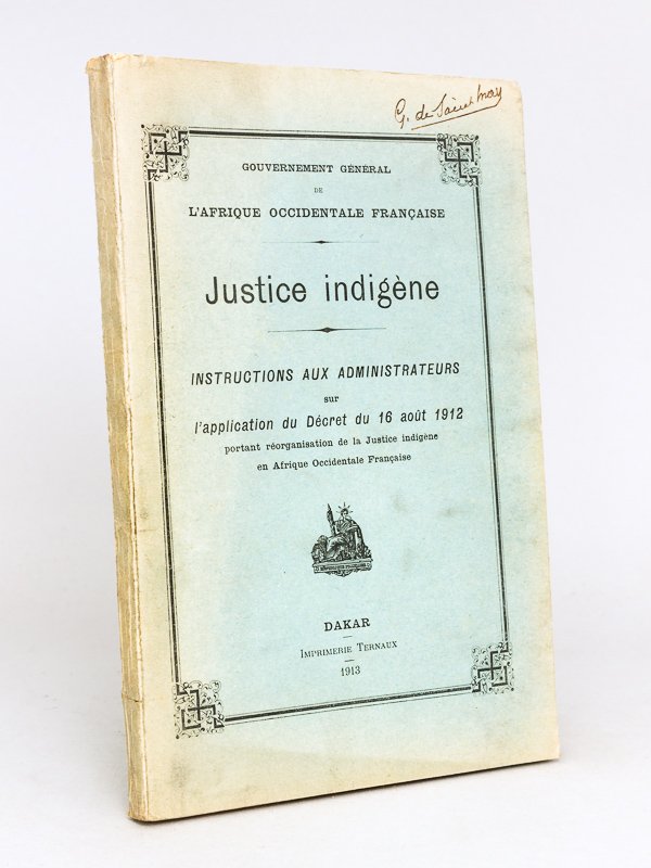 Gouvernement général de l'Afrique Occidentale Française. Justice Indigène. Instructions aux Administrateurs sur l'application du Décret du 16 août 1912 portant réorganisation de la Justice indigène en Afrique Occidentale Française [ Edition originale - Livre dédicacé par l'auteur ]