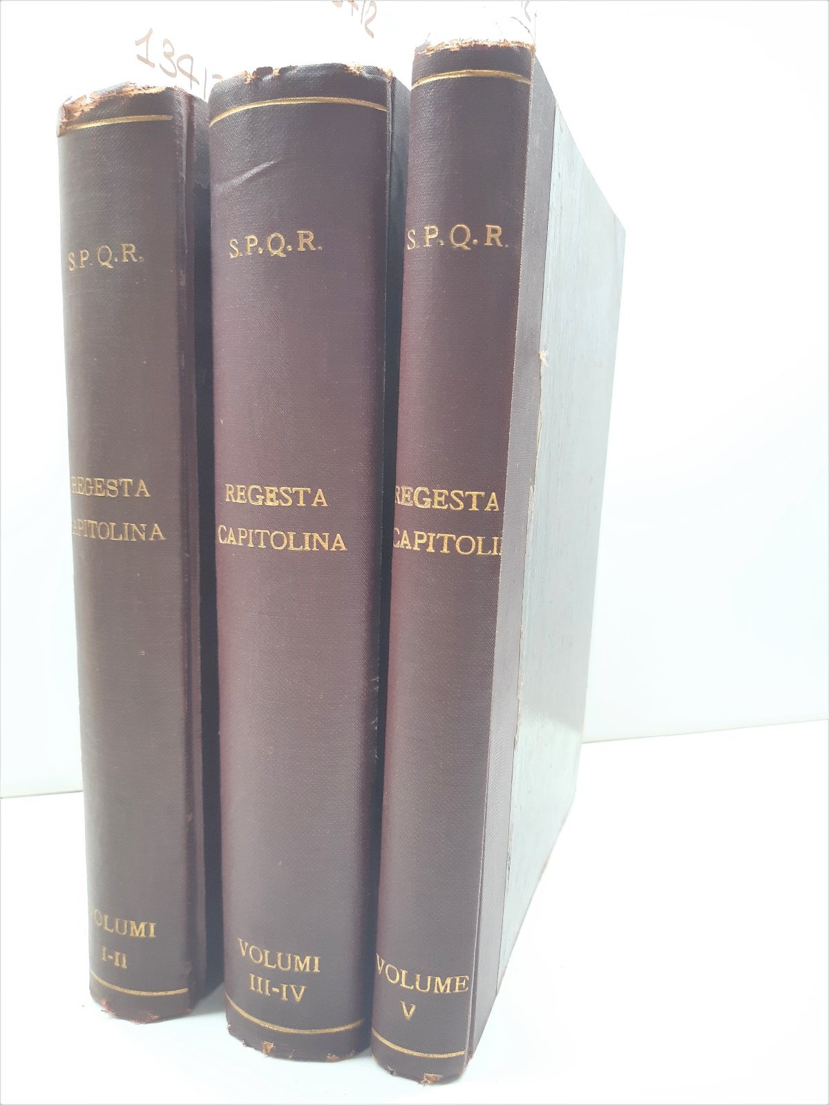 Tomo 1∞: fogli di guardia decorati leggermente bruniti ai margini, alla prima pagina bianca firma di possesso e un appunto a matita, interno in buono stato lieve brunitura al margine esterno delle pagine, rari segni a matita nel testo, tagli leggermente bruniti con alcune fioriture, impolverati quelli superiori. Nel primo tomo sono contenuti il volume 1∞ anni 1234-1305 Roma tipografia Cuggiani 1920 numero pagine 188 + 302