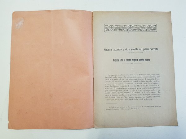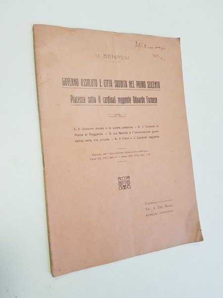 Estratto del "Bollettino storico piacentino" Anno XII, 1917, fasc. 6° - Anno XIII, 1918, fasc.1°-2°.<BR>In 8°; pp. 19; brossura editoriale; spillato.<BR>CONDIZIONI BUONE.<BR>Dedica dell'autore in copertina<BR>Indice: 1. Il Governo ducale e la quiete pubblica - 2. Il Comune di fronte al Reggente - 3. La Nobiltà e l'intromissione governativa nella vita privata - 4. Il Clero e il Cardinal reggente.