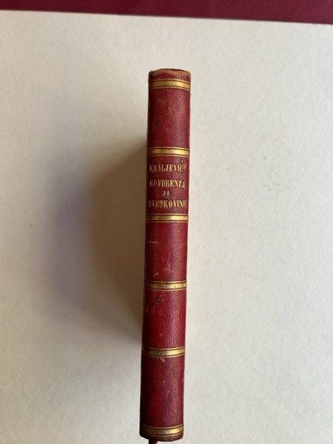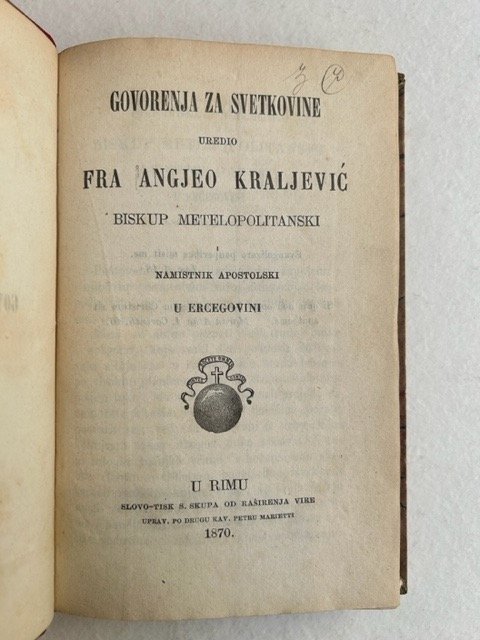 In-8° (175 x 115 mm.), pp. XI, 311, (1), mezza pelle dell'epoca, titolo e fregi in oro al dorso. Andeo Kraljevic (29 ottobre 1807 – 27 agosto 1879) è stato un francescano croato dell'Erzegovina e prelato della Chiesa cattolica che servì come vicario apostolico dell'Erzegovina nell'Impero Ottomano dal 1864 al 1879. Dal 1840 fu uno dei promotori dell'iniziativa per istituire la Custodia francescana dell'Erzegovina, separata dalla Provincia bosniaca. Divenne il primo capo della Custodia dell'Erzegovina prestando servizio come custode per due mandati non consecutivi, dal 1852 al 1856 e di nuovo dal 1862 al 1865. Nel 1864 Kraljevic fu nominato vicario apostolico dell'Erzegovina. Come vicario, nel 1872 contribuì alla fondazione della prima tipografia croata a Mostar, per evitare di chiedere continuamente alla Propaganda di pubblicare i suoi libri, cosa che fece con la sua opera dal titolo Govorenja za svetkovine (Discorsi durante le festività) quando si recò al Concilio Vaticano I. Durante il suo mandato scoppiò la rivolta dei cristiani, per lo più ortodossi orientali, contro l'impero ottomano. Durante la rivolta, Kraljevic dissuase i cattolici dalla partecipazione e chiese l'annessione della Bosnia ed Erzegovina all'Austria-Ungheria. L'opera dei francescani in questa zona, sin dal loro arrivo, ha sempre avuto un significato vitale per la cultura, la fede e per l'esistenza dei croati. I francescani arrivarono in territorio croato dai primi decenni del XIII secolo. Per l'intero periodo dell'occupazione turca (1463-1878) i francescani furono gli unici a curare le anime dei cattolici croati in Bosnia e Erzegovina e gli unici a sostenerli e difenderli dal potere turco. I francescani hanno svolto un importante ruolo nel destino del proprio popolo. Dopo che i turchi nella prima metà del XVI secolo distrussero tutti i conventi francescani in Erzegovina, la cura spirituale dei cattolici croati fu affidata ai francescani della cristianità dalmata, ovvero croata. Nel territorio della Bosnia e Erzegovina, ed anche di più, venne istituita la provincia francescana bosniaca. ruolo dei francescani in Bosnia