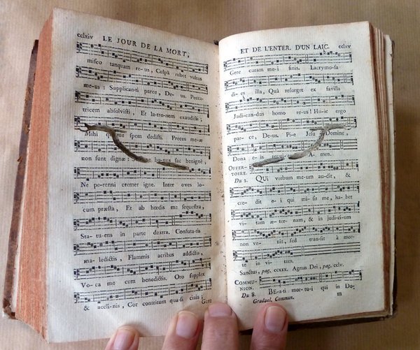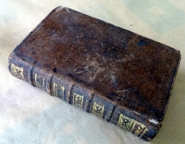 Un fort volume de format in 12 de 1f., 460 pp.; CCII pp.; en deux endroits des paritions manuscrites soigneusement calligraphiées ont été insérées dans le volume au moment de la reliure. Reliure de l'époque en pleine basane brune; dos à 5 nerfs à décor de caissons dorés, titre doré. Tranches rouges. Fentes aux charnières en pied; travail de vers en fin de volume. Coins marqués. Bon exemplaire malgré tout. Voir les photos.
