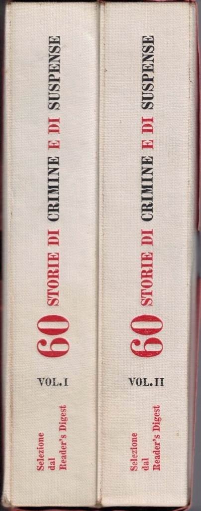Winston Graham et al., 60 storie di crimine e di suspence, Selezione dal Reader’s Digest, Milano 1967, 2 voll., pp. 940 (pp. 470 a volume), cm 20, mezza tela ed. con titoli al dorso, taglio superiore spruzzato in rosso e cofanetto ed. in cart. muto. Volume I, indice: Winston Graham, Partita con il morto – Murray Teigh Bloom, La straordinaria signora Piper – Gerald M. Moore, Autostop! – Anthony Abbot, La nave dei dormienti assassinati – Alva Johnston, Una simpatica canaglia – Byron Eshelman (con la collaborazione di Frank Riley), 25 minuti da vivere – Srthur Trevenning Harris, Ritratto di Harry – Henry Slesar, La casa che costava troppo – Jerome Beatty, Miracolo sul patibolo – Channing Pollock, Chi era quel chirurgo? – John William Rogers, La lettera scritta dagli uccelli – Frederic Sondern Jr., La grande truffa di Lisbona – J. Edgar Hoover, Il fulminatore – george H. Edeal, Il coro che fece tardi – Edwin Lanham, Delitto nella mia strada – Anthony Abbot, Il giallo che non fu mai scritto – Octavus Roy Cohen, Il dilemma di un detective – Joseph Blank, 30 ore in ostaggio – Anna Katherine Green, Anthony Abbot, Il medico, la moglie e la sveglia – Billy Rose, La prova decisiva – Toni Howard, La truffa atomica – Anthony Abbot, Delitto perfetto – Ann Huxley Kings, In quattro contro la Banca d’Inghilterra – Anthony Abbot, Enigma giudiziario – Ernest Havemann, In balia d’un criminale – Anthony Abbot, Il mistero dle console assassinato – harlan Jacobs, Quattro mesi con gli spiriti – T. E. Murphy, La rapina filmata in anticipo – Burton B. Turkus in collaborazione con Sid Feder, Assassinio di un assassino – Patrick Quentin, La vedova nera. Volume II, indice: Catherine Arley, La donna di paglia – Alexander Jordan, Un esempio di giustizia – Anonimo, Come sfuggii a un bruto – Terrence F. Flahiff, Delitto con l’aereo – Robert Hayden Alcorn, Il conte di Gramercy Park – Blake Clark, Come fu preso il criminale più braccato del mondo – Mary Roberts Rinehart, Cose che non so spiegarmi – Stewart Robertson, I più grandi falsari d’America – Fulton Oursler, L’ombra di un dubbio – Herbert Brean, L’insegnante impostore – Joseph P. Blank, C’è un assassino in giro – Barrett Willoughby, Una notte in Alasca – Lester Velie, Vita turbinosa d’un genio traviato – Jean Burton, Il medium più famoso – Karl Detzer, Nessun indizio! – J. Edgar Hoover, Il tesoro nella tomba – George Waller, Il caso del baby Lindbergh – Conrad Christiano, John Van Buren, L’inchiostro miracoloso – Joseph Phillips, Non c’è errore senza appello – Donald Honig, L’uomo sul cornicione – Fulton Ourler, Un delitto al Reader’s Digest – Evan Mcleod Wylie, Il caso della banca dinamitata – Joseph P. Blank, Chi aveva ucciso Les Wilson? – Joan Henry, Condannata a morte – William F. McDermott, Karl Detzer, Cinquemila dollari per Joe – Carl Carmer, Il fantasma della ragazza in viola – Anthony Abbot, 15 minuti cruciali – Stuart K. Brandon, Don Eddy, L’uomo che non doveva morire – Stewart H. Holbrook, Dramma all’università – Margery Allingham, I testimoni di cera. Leggere tracce d’uso, minima brunitura della carta, per il resto ben conservato.