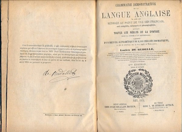 In 8° , m.pelle , pp. VII + 211. Segue: L'Instructeur pratique et Théorique de la Prononciation Anglaise.Pp. XIV + 150 + 86. Lettere e fregi al d. in oro.