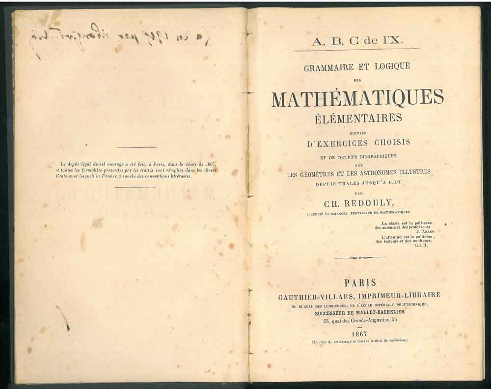 Grammaire et logique élémentaires suivies d'exercices choisis et de notices biographiques sur les géomètries et les astronomes illustres depuis Thalès, jusqu'a Biot. par Ch. Redouly