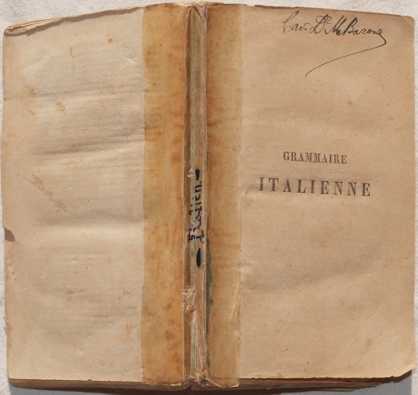 In 16. Dim. 15,5x10 cm. Pp. VIII+179. Edizione del 1876 di questa grammatica della lingua italiana all'utilizzo dei francesi. All'interno sono presenti venti lezioni: pronuncia, articoli, preposizioni, regole per il plurale, genere, aggettivi, nomi, pronomi, verbi, avverbi, preposizioni ecc. Alla fine raccolta dei nomi più utilizzati, verbo avere ed essere, scelta di idiotismi ed esercizi, proverbi, "storiette per uso de Principianti", "Venti squarci di bello stile scelti da migliori antichi e moderni per opera di Giuseppe Zirardini". Brossura mancante e dorso riparato con del nastro adesivo. In discrete condizioni. Antica firma all'occhietto ed al frontespizio. Copertina mancante e dorso riparato con del nastro adesivo. Legatura in discrete condizioni con qualche pagina staccata. All'interno le pagine si presentano in buone condizioni con rare fioriture. Edition of 1876 of thsi grammar of italian language for the usage of french people. Insdie there are twenty lessons: pronounciation, articles, prepositions, rules for plural, adjectives, names, pronouns, verbs, adverbs, prepositions etc. At the end collection fot he most used names, verb to have and to be, chosen of exercises, proverbs, "storiette per uso de Principianti", "Venti squarci di bello stile scelti da migliori antichi e moderni per opera di Giuseppe Zirardini". Cover is missing and spine repaired with adhesive tape. In fair conditions. Ancient signature in the false title page and in the title page. Cover is missing and spien repaired with adhesive tape. Binding in fair conditions with some page detached. Inside pages are in good conditions with occasional foxings.