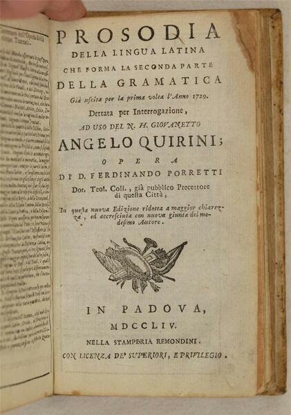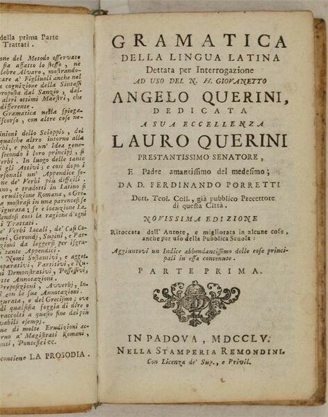 GRAMMATICA DELLA LINGUA LATINA DETTATA PER INTERROGAZIONE AD USO DEL N. G. GIOVANETTO ANGELO QUERINI unito a PROSODIA DELLA LINGUA LATINA CHE FORMA LA SECONDA PARTE DELLA GRAMMATICA