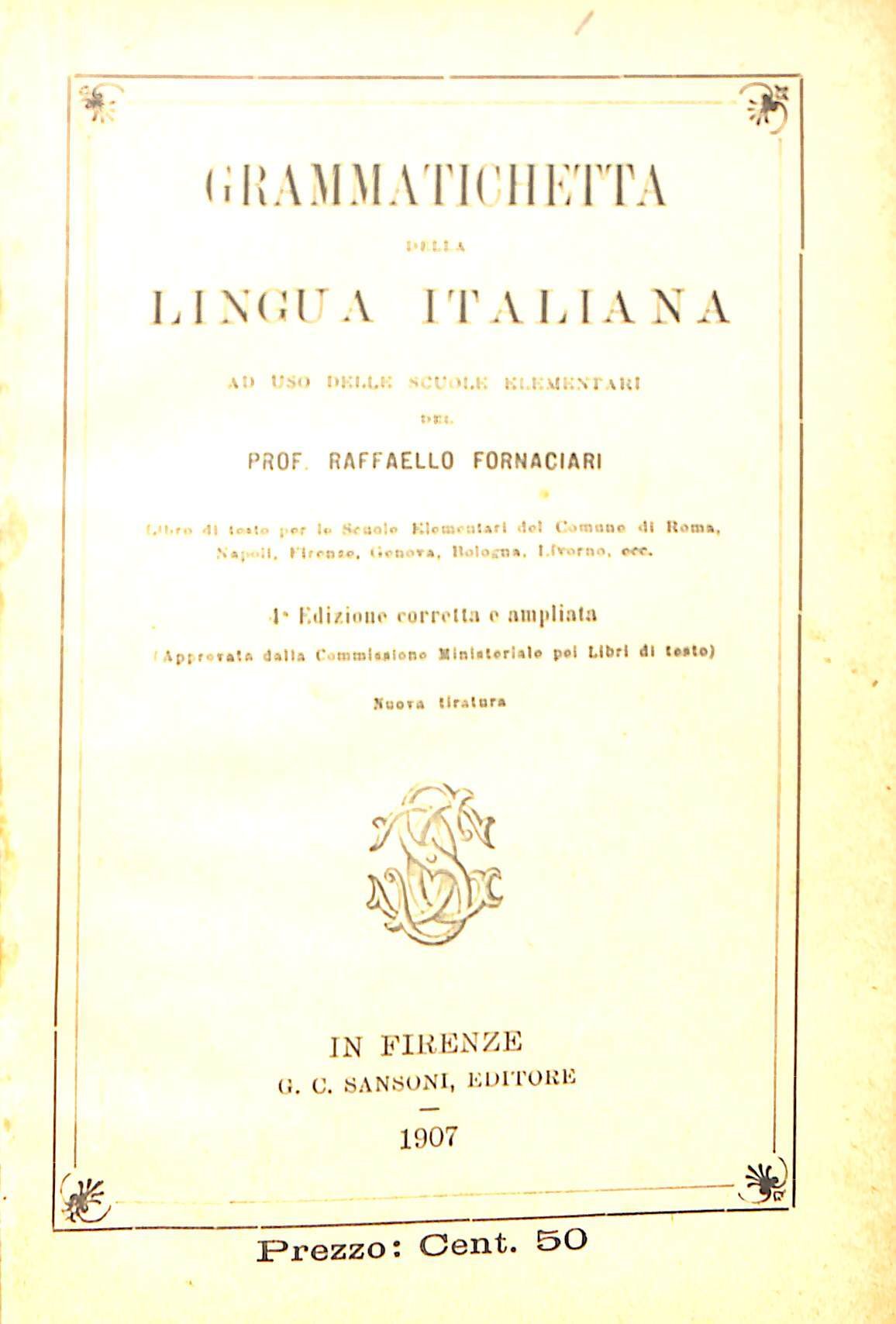 Raccolta di varie grammatiche della lingua italiana rilegate insieme. 1. Grammatichetta della lungua italiana ad uso delle scuole elementari, Raffaello Fornaciari, Sansoni 1907. 2. Breve grammatica della lingua italiana ad uso dele scuole complementari, Raffaello Fornaciari, Sansoni 1908. 3. Grammatica italiana dell'uso moderno, Raffaello Fornaciari, Sansoni 1909, prima e seconda parte. 4. Grammatica italiana dell'uso moderno, Raffaello Fornaciari, Sansoni 1892. 5. Sintassi italiana dell'uso moderno, Raffaello Fornaciari, Sansoni, 1897. 453 - Ba Buono (Good)